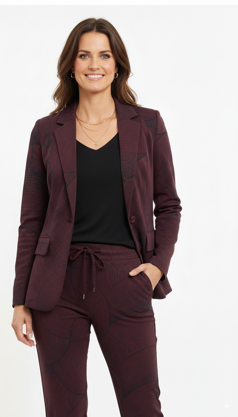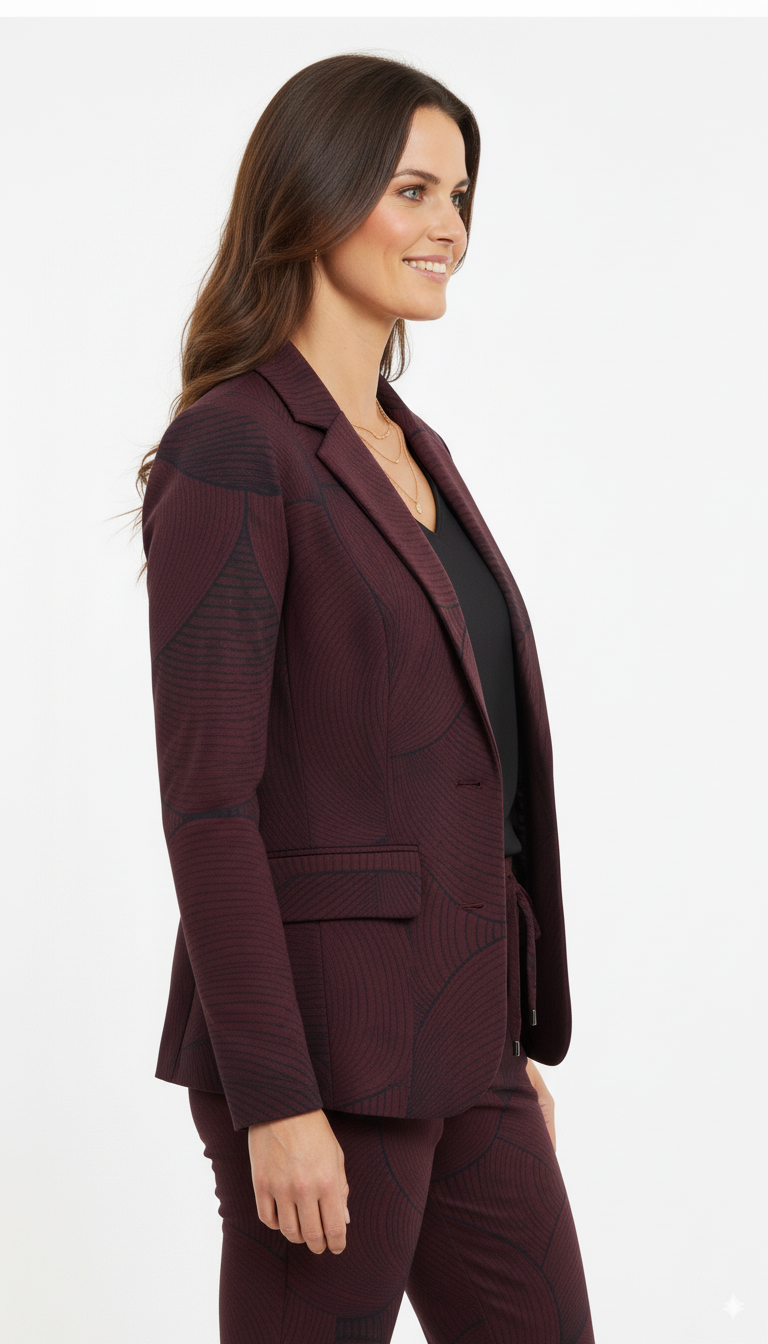 Maak kennis met Mi Piace – Bordeauxrode Blazer met Geometrisch Patroon