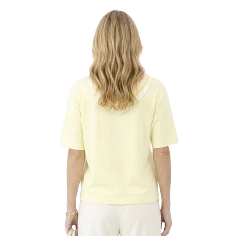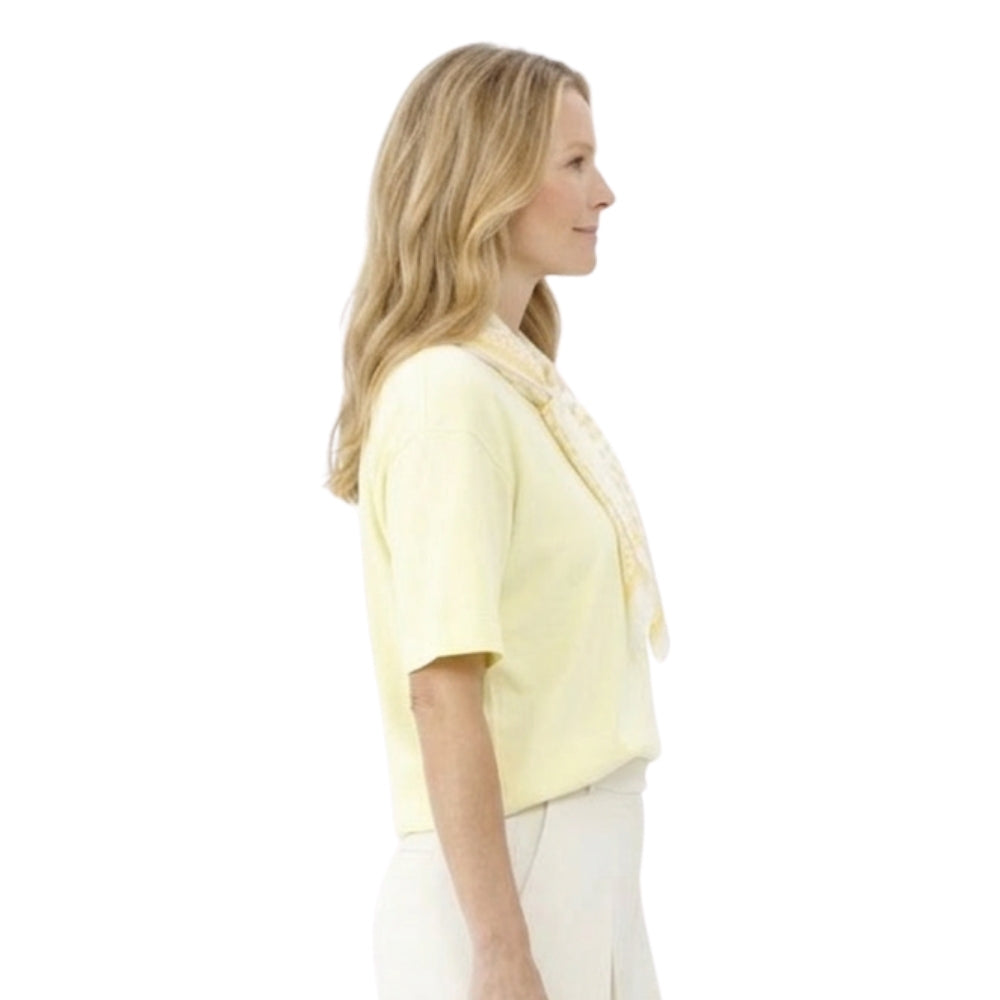 Dit oversized T-shirt in een zachte citroengele tint straalt frisheid en comfort uit. Het bijpassende sjaaltje geeft een speelse en stijlvolle touch, waardoor dit item net even anders is dan een basic T-shirt.