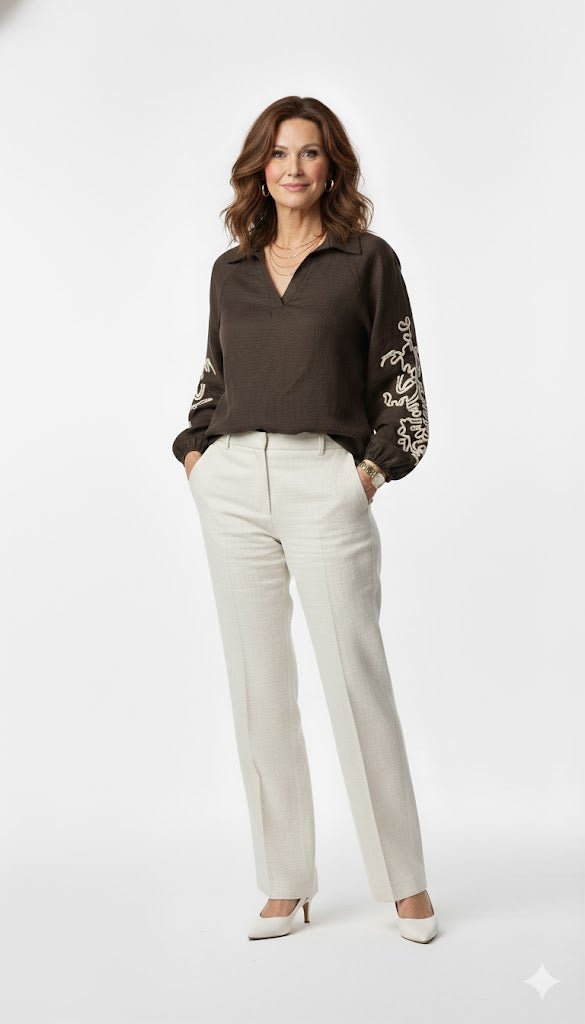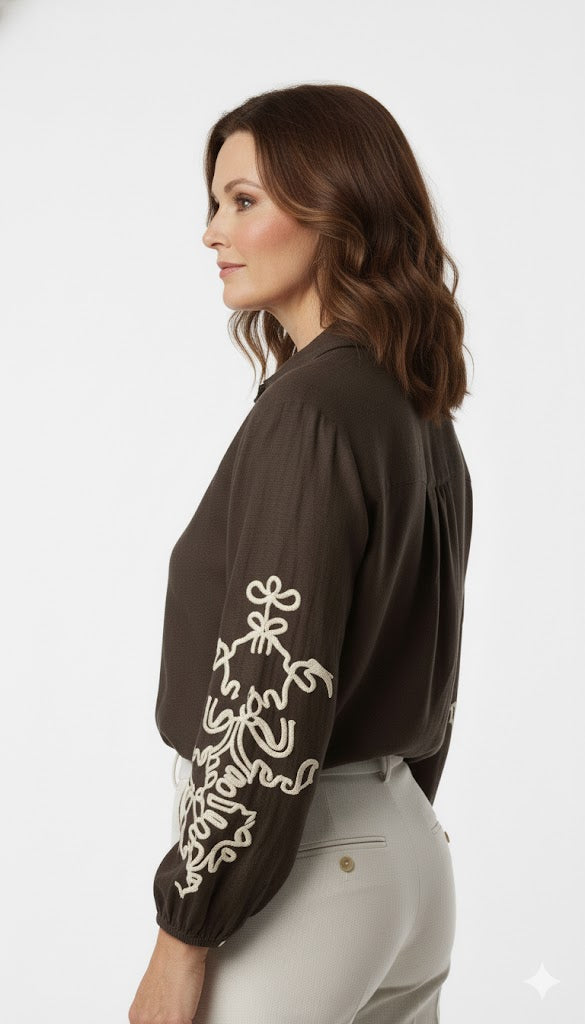 Maak kennis met Bruine blouse met geborduurde mouwen stijlvolle dames top