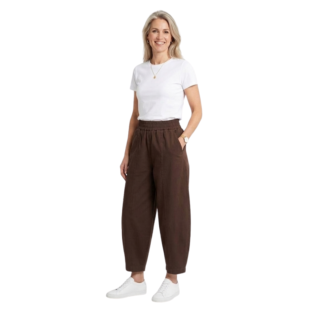 De Indy 7/8 katoenen ballonbroek in bruin geeft jouw outfit een warme en moderne uitstraling. De ballonpasvorm en cropped lengte zorgen voor een speelse, comfortabele look met een stijlvolle twist.