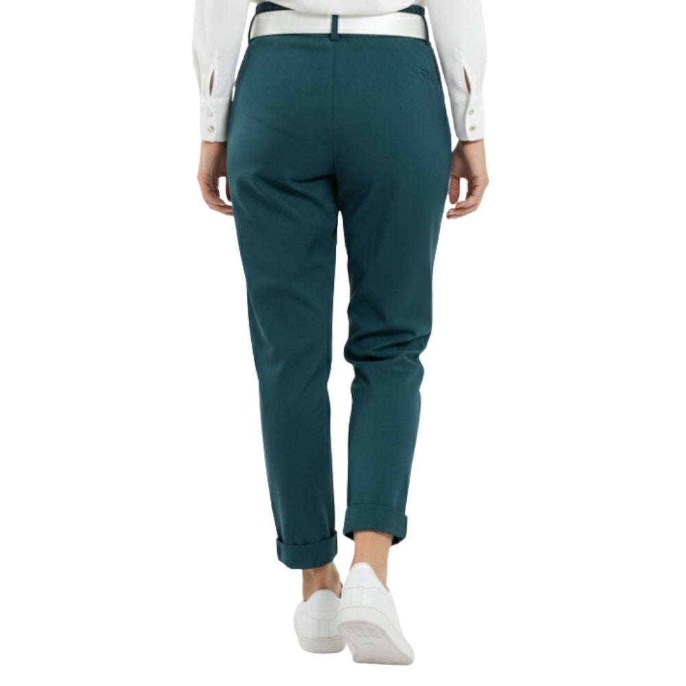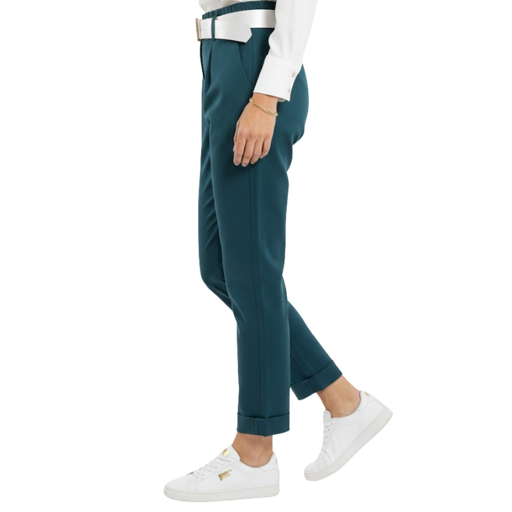 De broek heeft een tijdloze, slanke pasvorm met een moderne uitstraling. De omgeslagen pijpen geven een speelse en eigentijdse touch, terwijl de bijpassende riem zorgt voor een verfijnde afwerking. De elastische tailleband aan de achterzijde biedt extra comfort en een perfecte fit.
