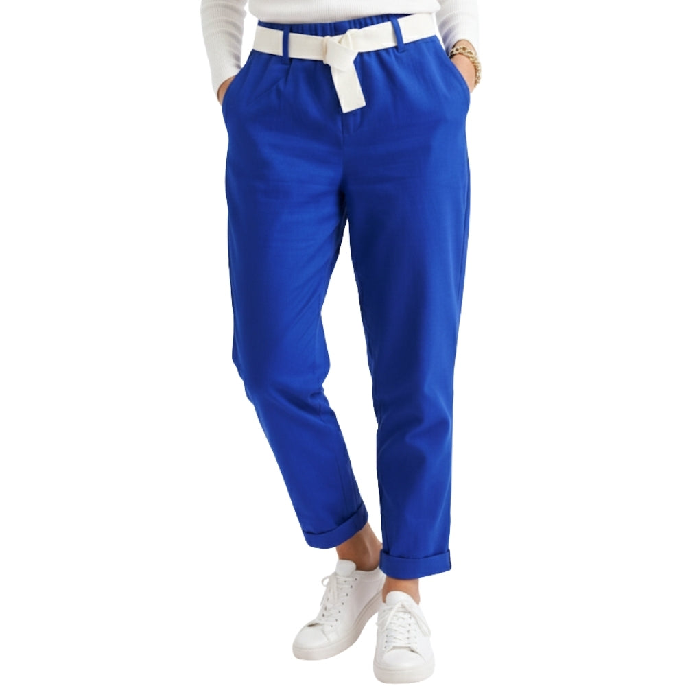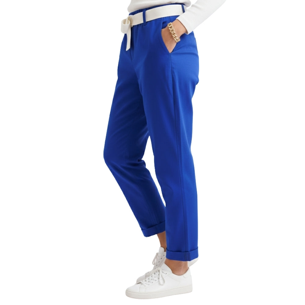 Deze stijlvolle chino broek in een krachtige kobaltblauwe kleur is een echte must-have voor iedere garderobe. De broek heeft een elegante, tijdloze pasvorm met smal toelopende pijpen en een moderne omslag aan de onderzijde. Dankzij de comfortabele stretchkwaliteit sluit de broek mooi aan en biedt hij optimale bewegingsvrijheid.