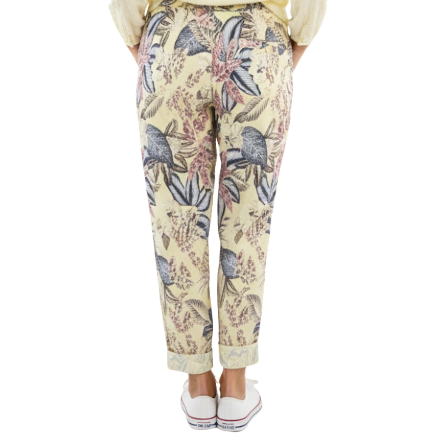 Frisse stretch chino in een zachte lemon tint met een stijlvolle botanische print. Comfortabel, vrouwelijk en perfect voor een casual-chique look.