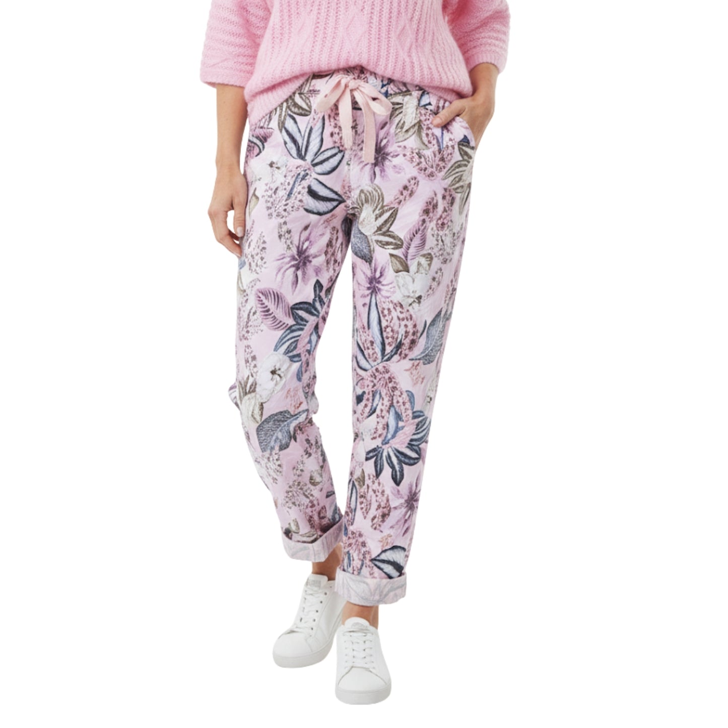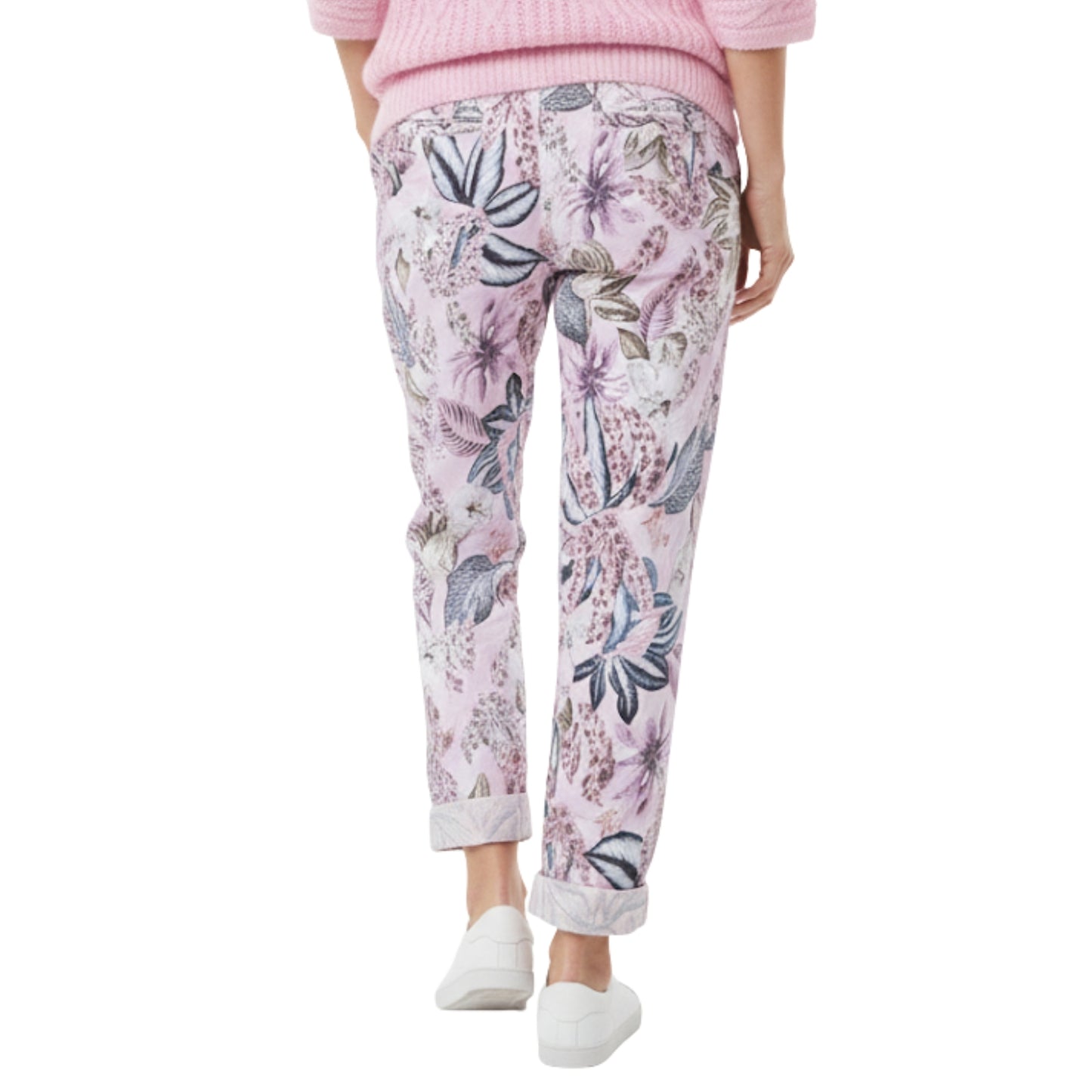 Trendy stretch chino in een zachte roze tint met een stijlvolle all-over print. Comfort en fashion komen perfect samen in dit veelzijdige model.