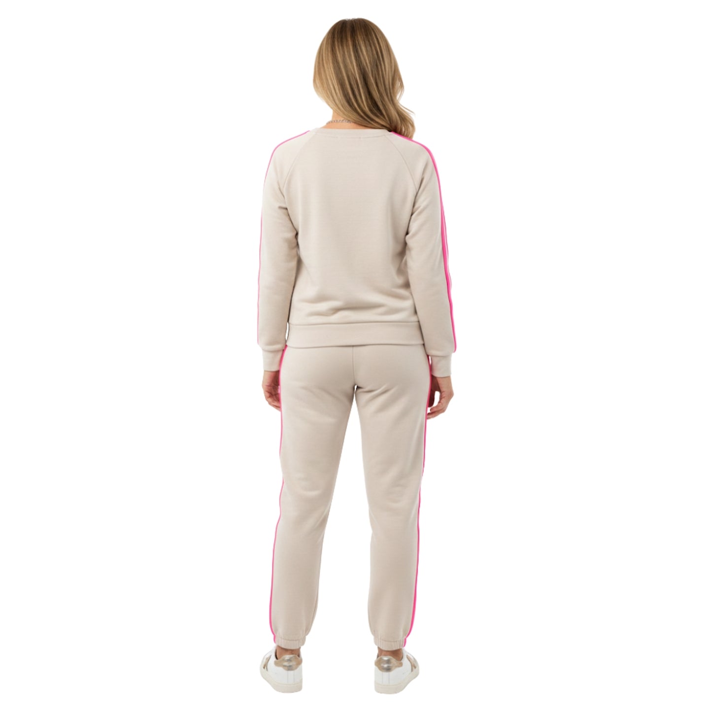 Comfortabele en stijlvolle 2-delige set in een zachte beige tint met opvallende roze details. Een perfecte mix van sportief en casual chic.
