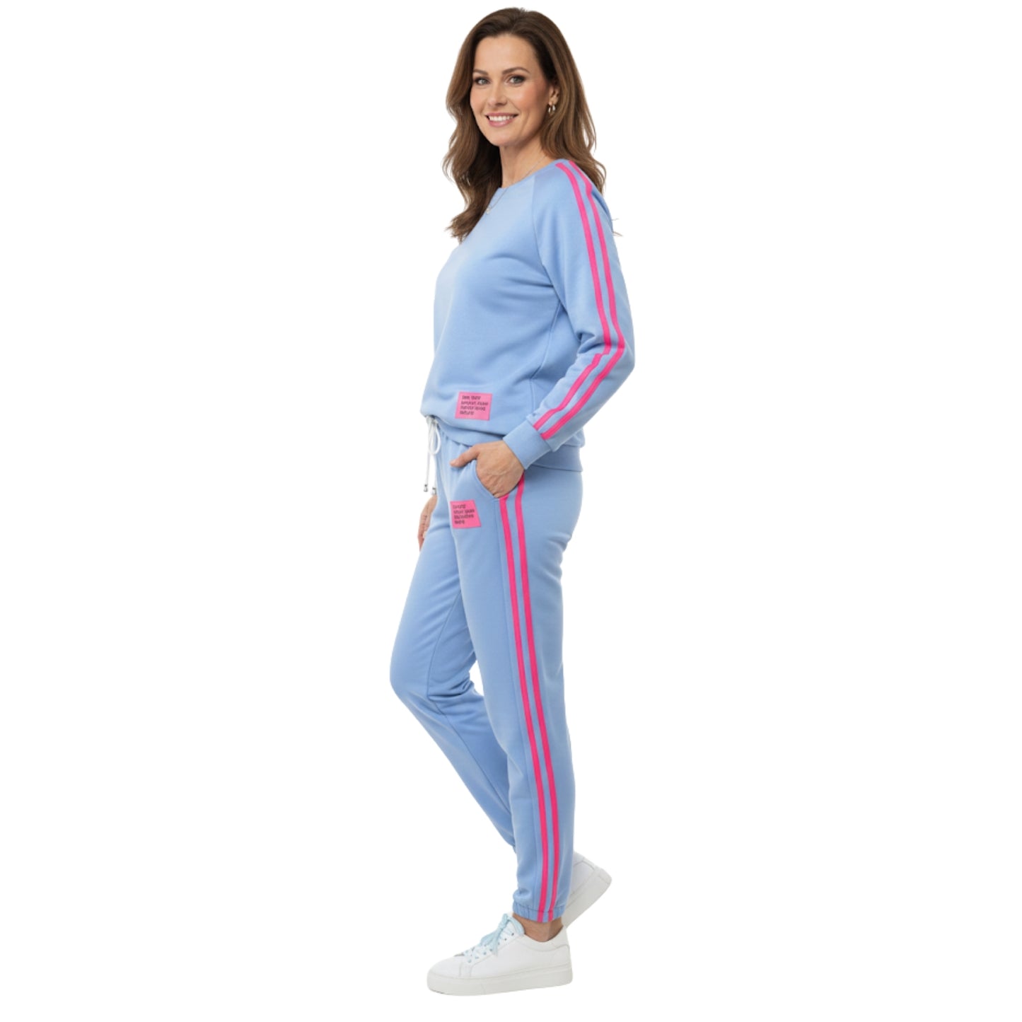 - Contrasterende roze strepen op de mouwen en zijkant van de broek