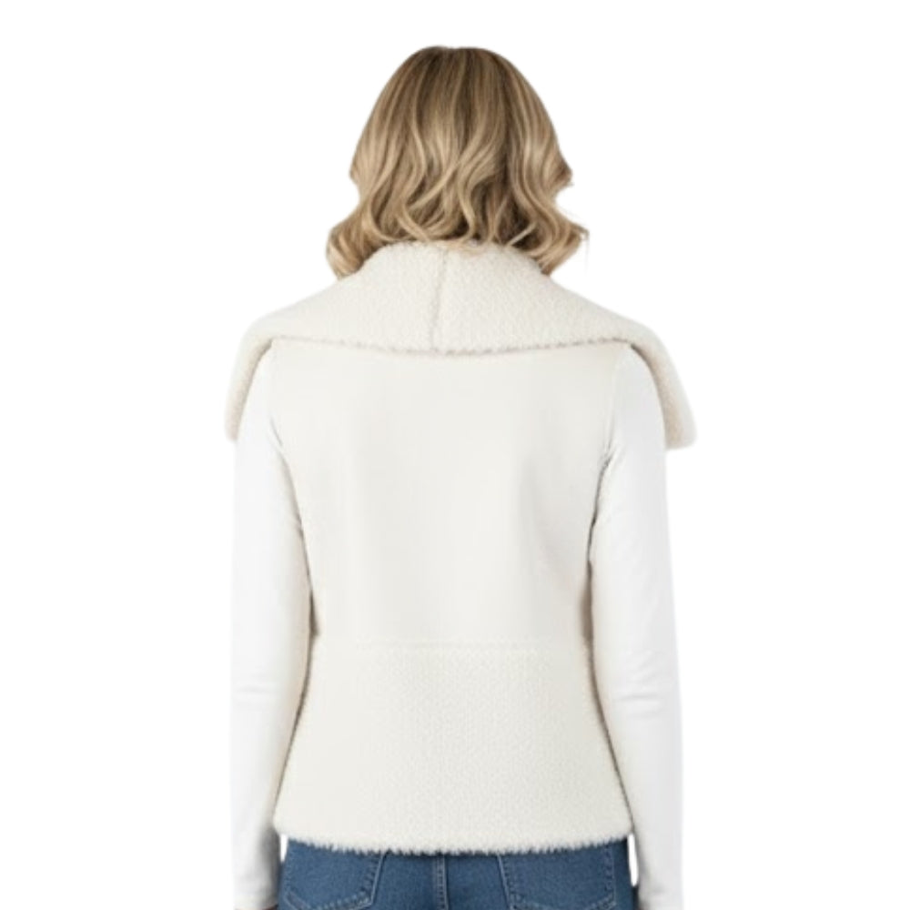 De korte lengte maakt deze jacket ideaal voor layering. Draag hem over een lange trui of jurk waarbij de onderkant onder de jacket uitkomt voor een gelaagde look die interessant en doordacht is. Dit is een slimme manier om extra warmte toe te voegen zonder dat je outfit te bulky wordt. De witte kleur zorgt ervoor dat de focus blijft op de clean, moderne uitstraling.