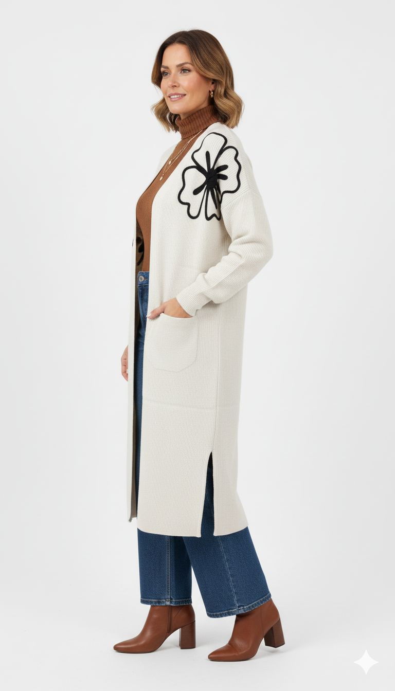 Maak kennis met Crèmekleurig lang vest met bloemenapplicatie – stijlvolle dames cardigan