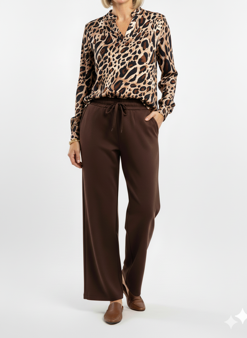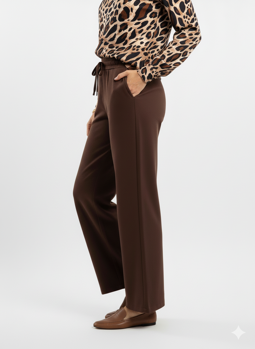 Deze donkerbruine damesbroek is een veelzijdige klassieker die comfort en stijl combineert. De broek is voorzien van rechte pijpen en een elastische tailleband met strikkoord, waardoor hij niet alleen elegant oogt, maar ook de hele dag comfortabel draagt.