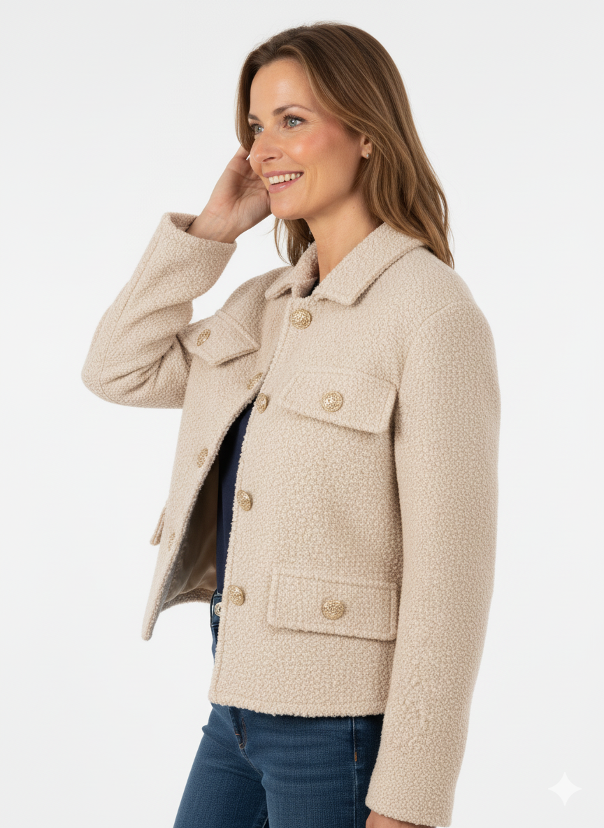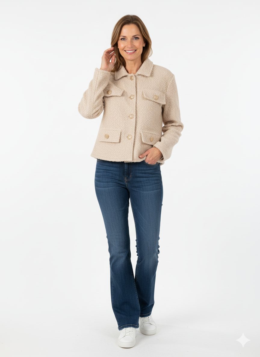 De beige dames blazer jas is een must-have voor de moderne vrouw die houdt van elegantie en veelzijdigheid. Deze jas is voorzien van vier praktische klepzakken en afgewerkt met chique gouden knopen die direct in het oog springen.