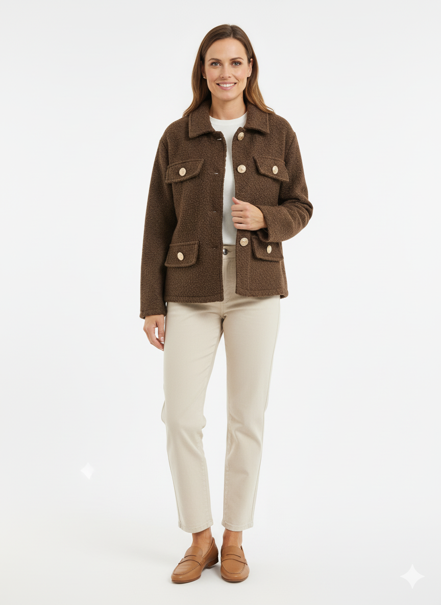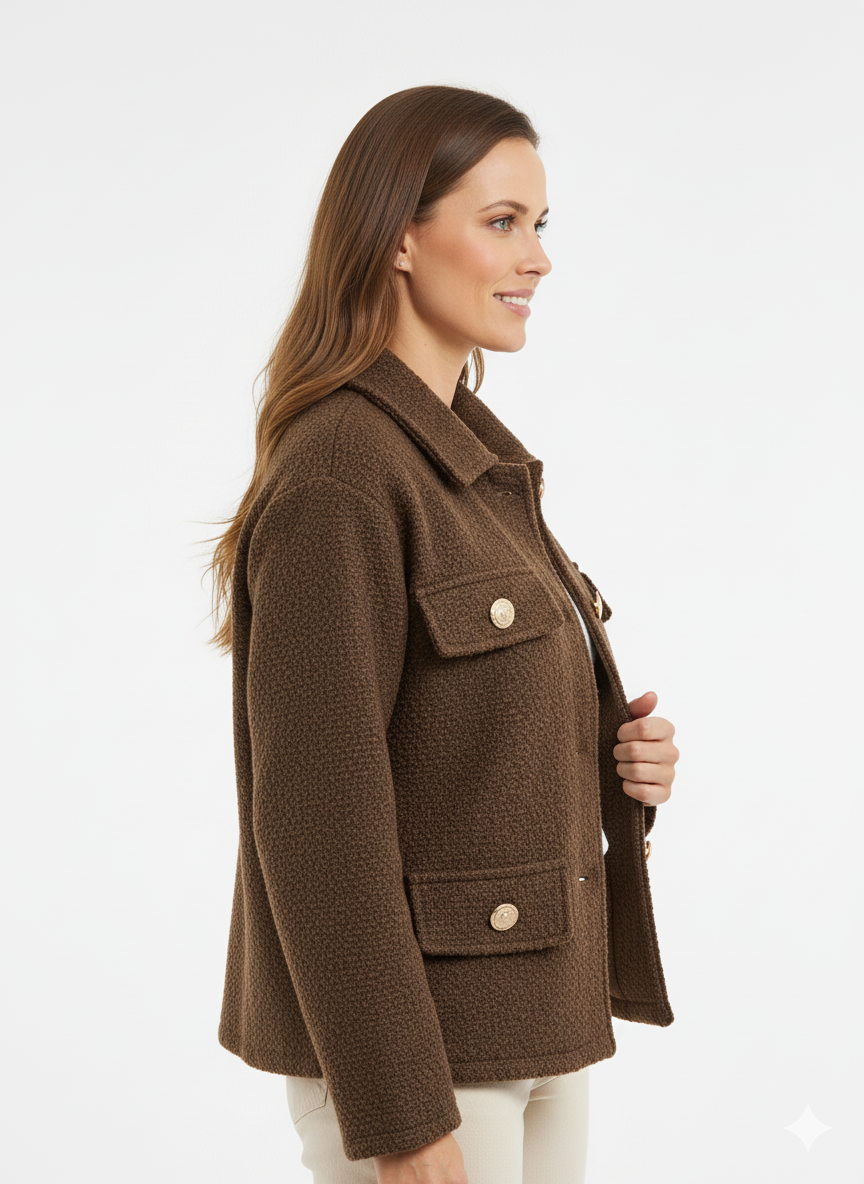 De bruine dames blazer jas is een veelzijdig kledingstuk dat luxe en comfort combineert. De jas heeft vier klepzakken en is afgewerkt met stijlvolle gouden knopen die een chique accent geven.