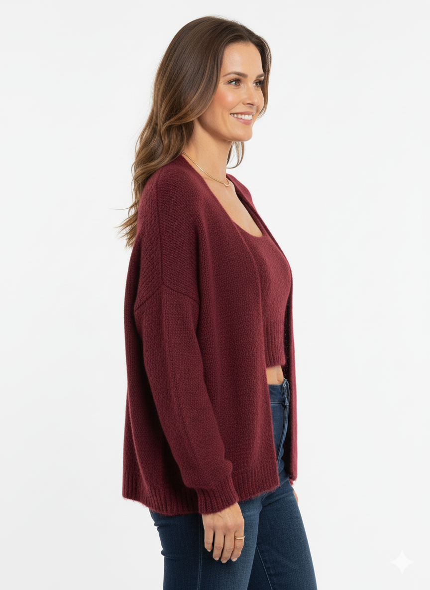 Bordeauxrode Knit Set – Cropped Top & Los Vest