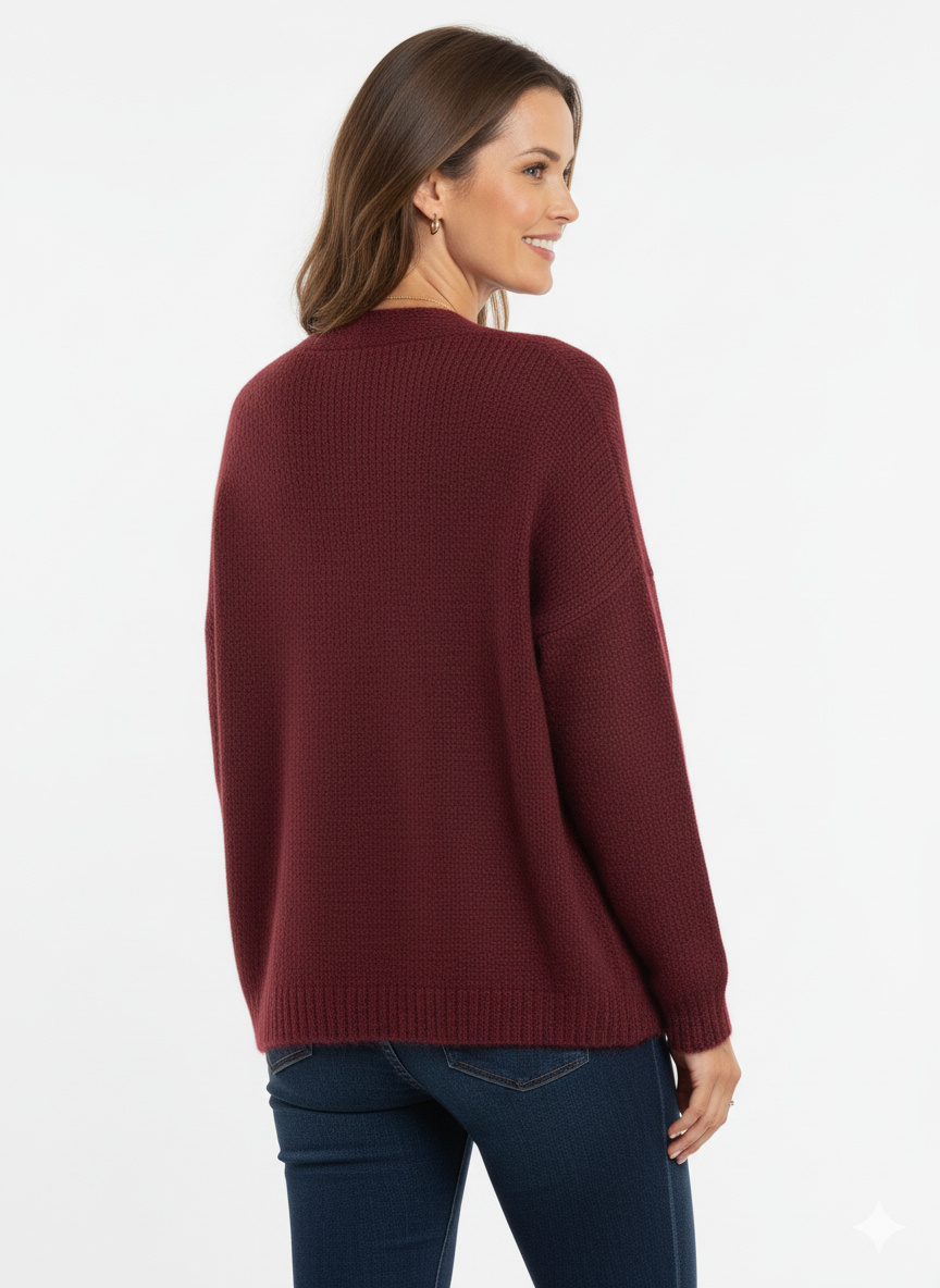Het stijlvolle design maakt deze set veelzijdig: draag hem casual met een jeans en sneakers, of combineer met een rok en laarzen voor een chique uitstraling. Dankzij de diepe bordeauxrode kleur straalt deze set elegantie en warmte uit.
