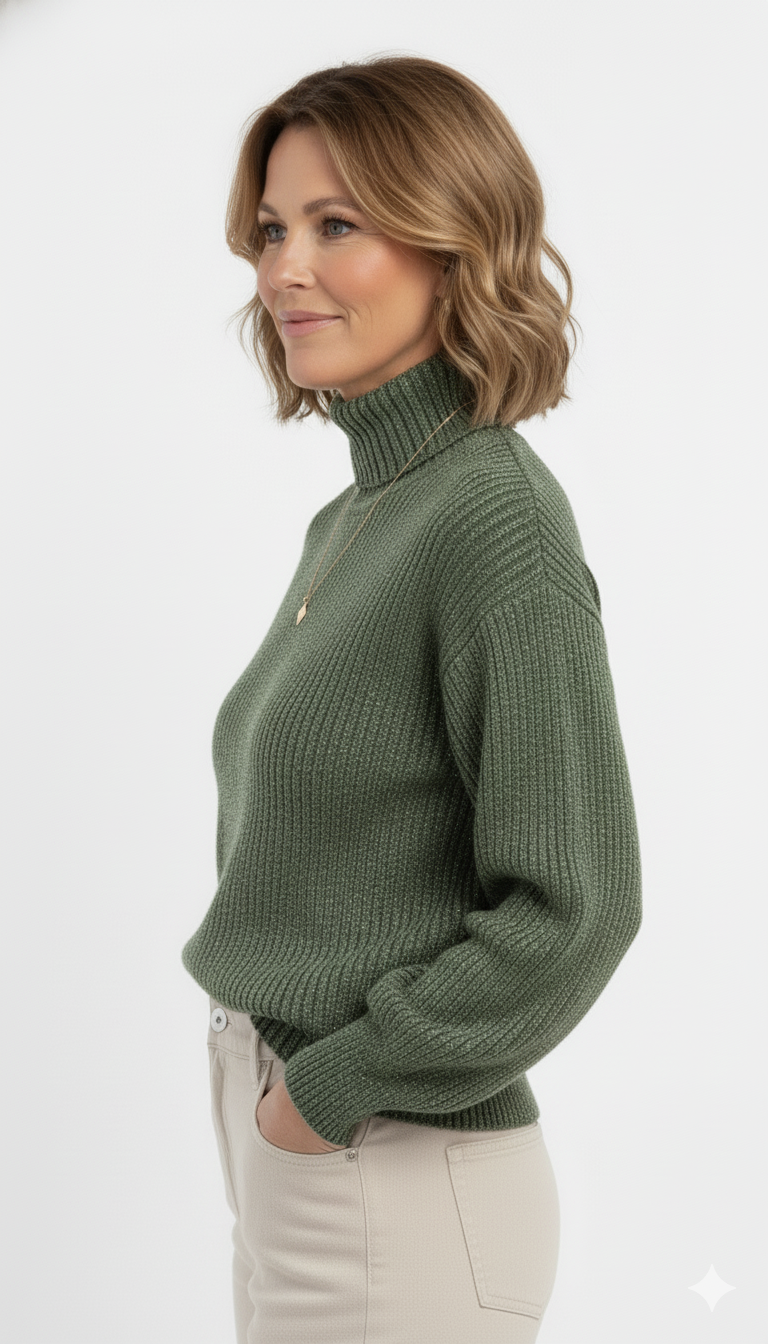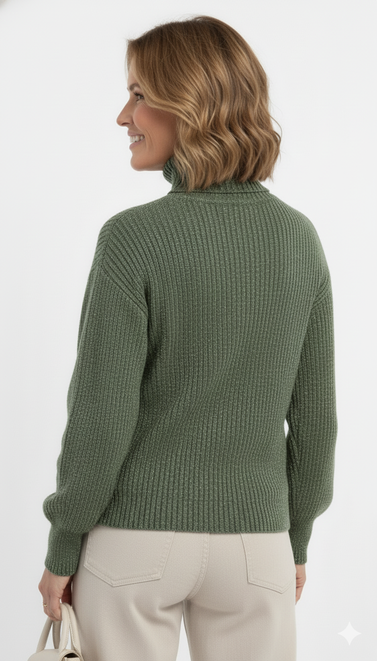 Deze groene rib coltrui combineert warmte, comfort en stijl in één tijdloos ontwerp. De fijngebreide ribstructuur zorgt voor een mooie pasvorm en een luxe uitstraling, terwijl de zachte, warme stof heerlijk comfortabel aanvoelt op koude dagen.