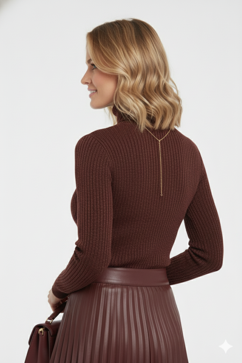 Deze bordeaux coltrui met ribstructuur is een must-have voor elke stijlvolle garderobe. De trui heeft een elegante col, fijne glitters en een aangesloten pasvorm die het lichaam prachtig volgt. Het zachte, comfortabele materiaal zorgt voor warmte en een luxe uitstraling – ideaal voor herfst en winter.