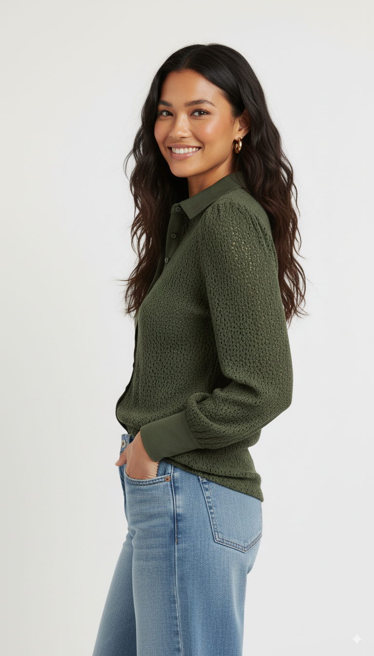 De Mi Piace olijfgroene damesblouse met lange mouwen is een veelzijdige en stijlvolle aanvulling op je garderobe. De prachtige olijfgroene kleur straalt rust, luxe en elegantie uit, terwijl de klassieke kraag, knoopsluiting en subtiele structuur de blouse een moderne en verfijnde touch geven.