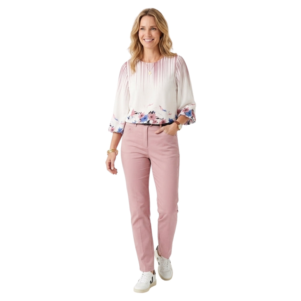 Deze satijnlook blouse in wit met oudroze en blauwe bloemenprint geeft een verfijnde en frisse uitstraling. De zachte glans, vrouwelijke pofmouwen en kleurrijke print maken dit een echte eyecatcher voor elke gelegenheid.