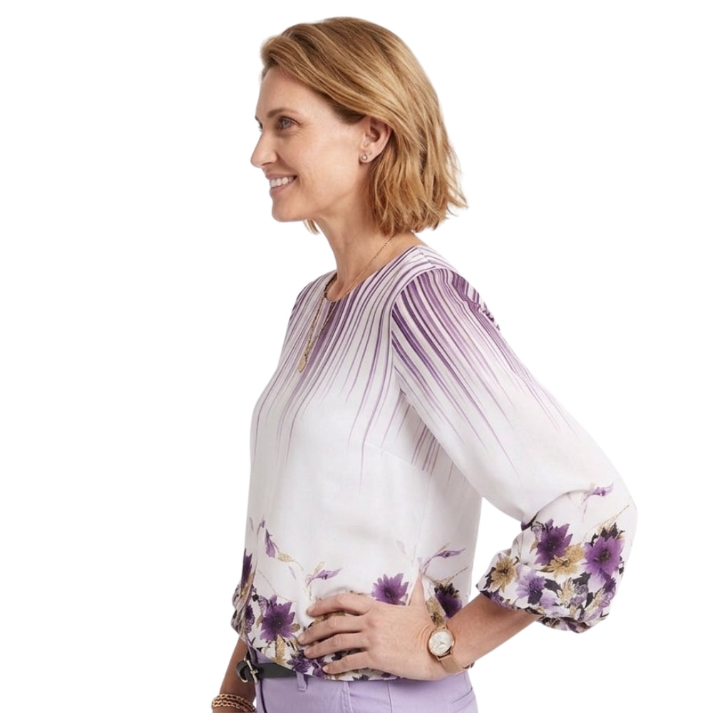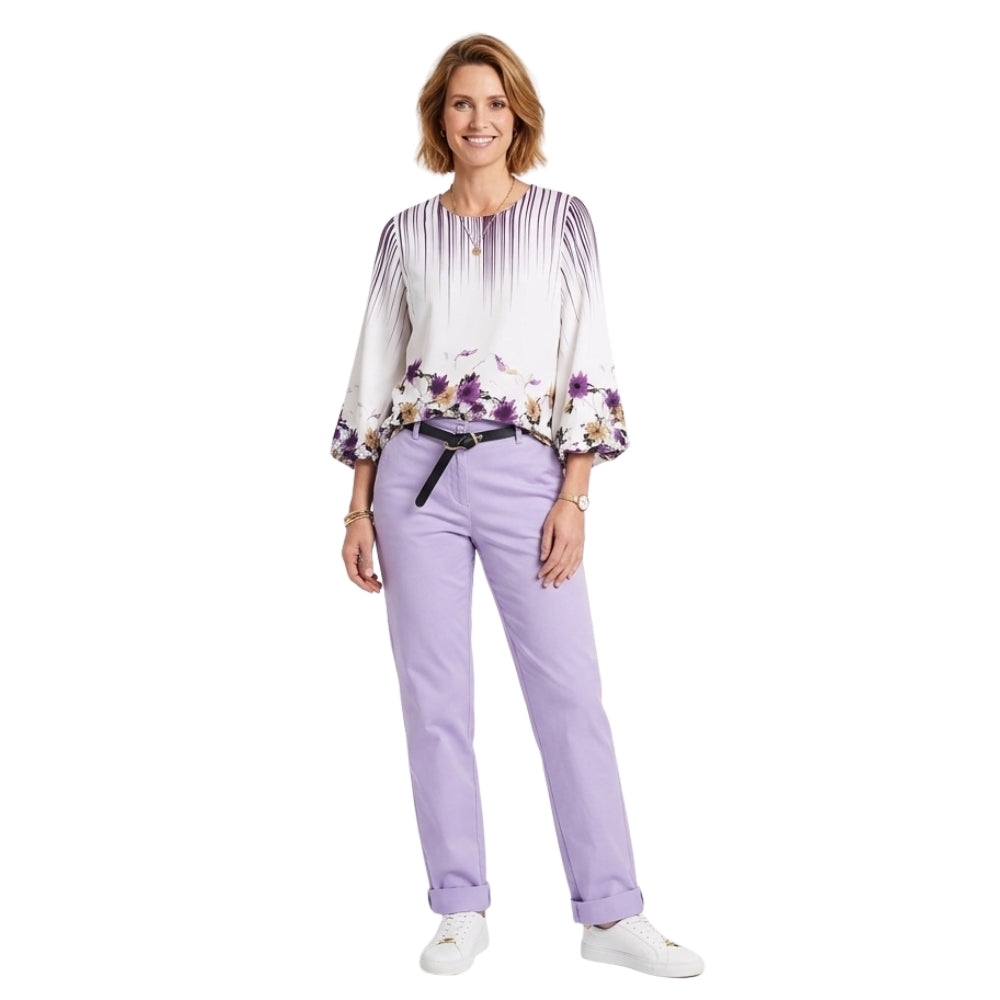Deze wit-paarse satijnlook blouse met bloemenprint en pofmouwen straalt pure elegantie uit. De zachte glans, speelse bloemenprint en volumineuze mouwen geven een vrouwelijke en luxe uitstraling.