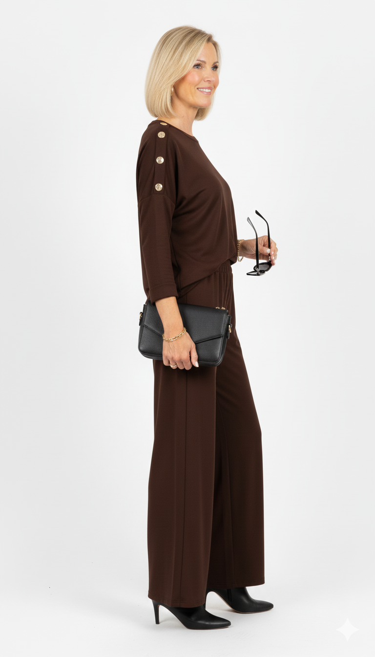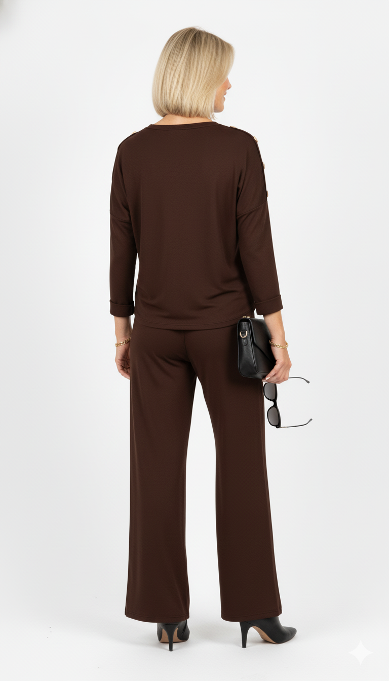 Deze donkerbruine dames set met gouden knopen combineert comfort en klasse in één stijlvolle outfit. De top heeft een elegante rechte pasvorm met subtiele gouden knoopdetails op de schouders, die zorgen voor een luxe en verfijnde uitstraling. De rechte broek met elastische taille en soepele stof biedt ultiem comfort en een mooie, flatterende pasvorm.