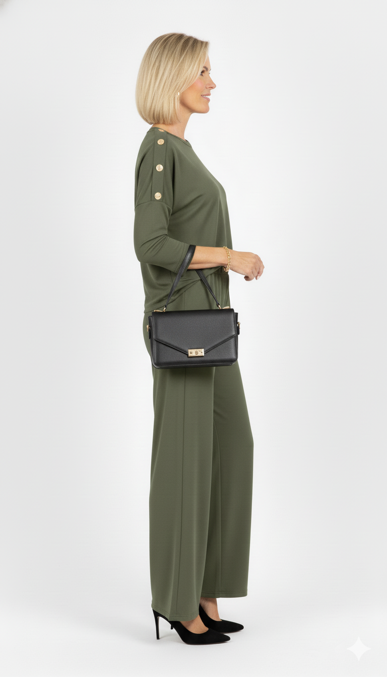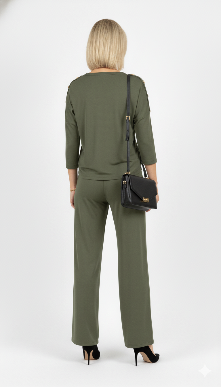 Maak kennis met Groene Dames Set met Gouden Knopen Luxe Co-ord met Rechte Broek