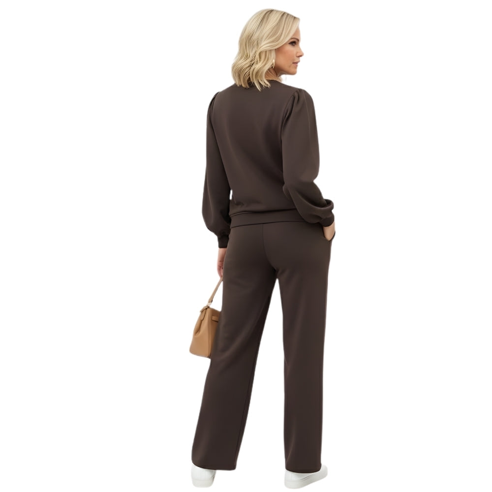 Voor een professionele setting kun je de set stylen met zwarte pumps en een blazer. De bruine kleur voegt warmte toe aan je werkgarderobe zonder te informeel te zijn. Het is een slimme manier om persoonlijkheid te tonen terwijl je toch professioneel blijft. Haal de blazer uit na werktijd en je bent klaar voor een borrel of casual diner.