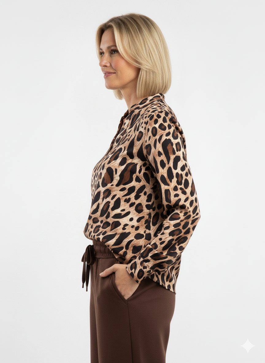 Deze dames blouse met dierenprint is een echte must-have voor liefhebbers van stijlvolle en tijdloze mode. De blouse is uitgevoerd in warme beige- en bruintinten en heeft een elegante V-hals en lange mouwen, wat zorgt voor een moderne en vrouwelijke uitstraling.