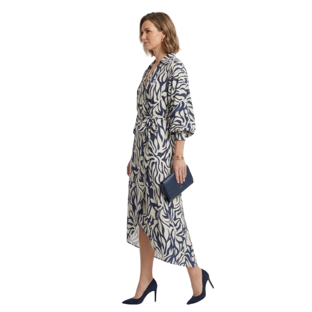 De Sienna satijnen overslagjurk in marineblauw straalt pure klasse uit. De diepe kleur gecombineerd met de glanzende satijnstof en overslagpasvorm zorgt voor een flatterend en verfijnd silhouet.