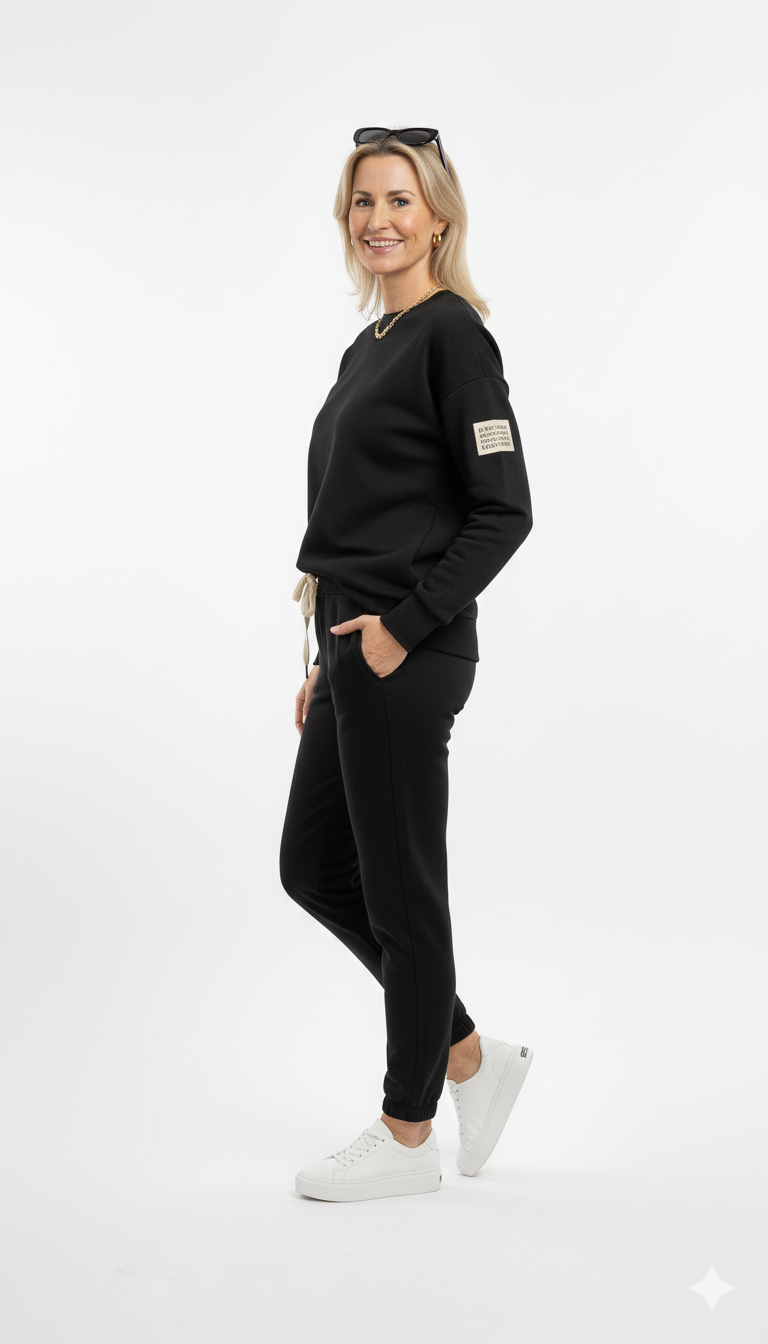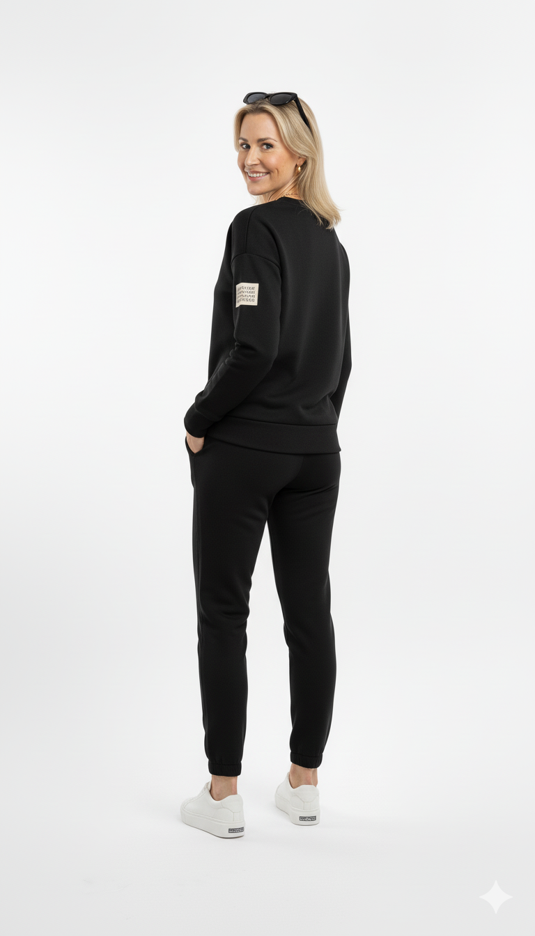 Ga voor een moeiteloze combinatie van stijl en comfort met dit zwarte dames joggingpak. De set bestaat uit een zachte trui met ronde hals en een bijpassende broek met elastische taille en trekkoord.