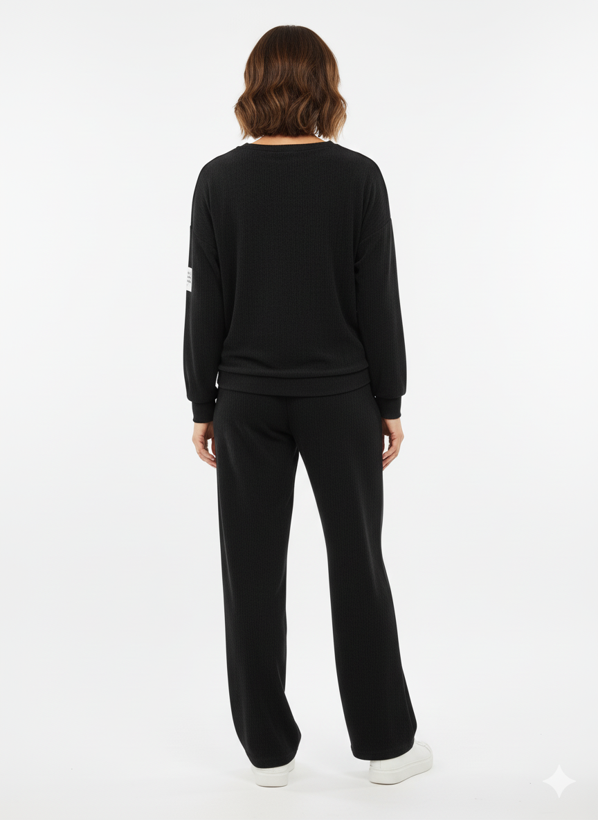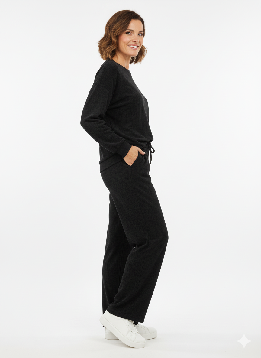 De zwarte loungewear set voor dames combineert ultiem comfort met een moderne uitstraling. De set bestaat uit een lange mouwen trui met ronde hals en een losvallende broek met elastische tailleband en rechte pijpen. De diepe zwarte kleur geeft de set een tijdloze en stijlvolle uitstraling.