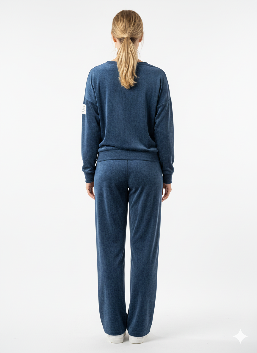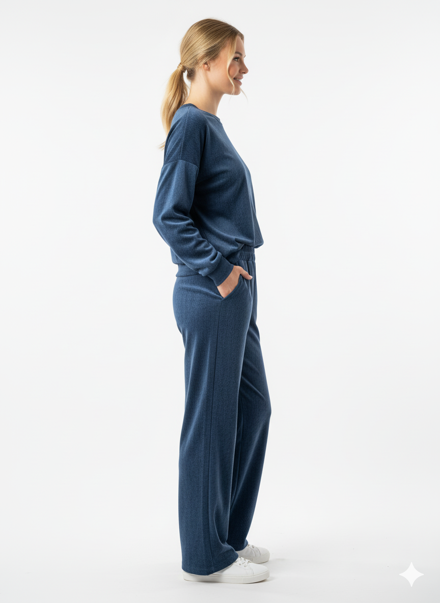 De blauwe loungewear set voor dames is dé perfecte combinatie van comfort en stijl. De set bestaat uit een lange mouwen trui met ronde hals en een losvallende broek met elastische tailleband en rechte pijpen. De stijlvolle blauwe kleur geeft de set een frisse en trendy uitstraling, terwijl de zachte stof zorgt voor ultiem draagcomfort.