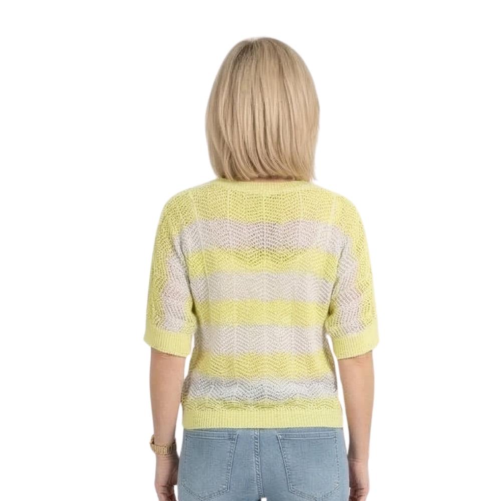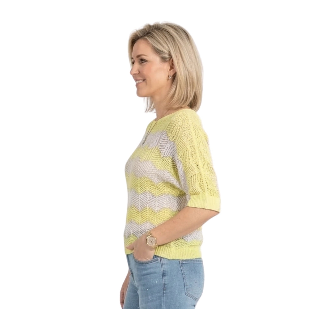 Deze fijngebreide top in citroen-wit met zigzag patroon brengt direct een frisse en energieke vibe in je outfit. De lichte kleuren en het speelse patroon maken dit de perfecte top voor zonnige dagen.