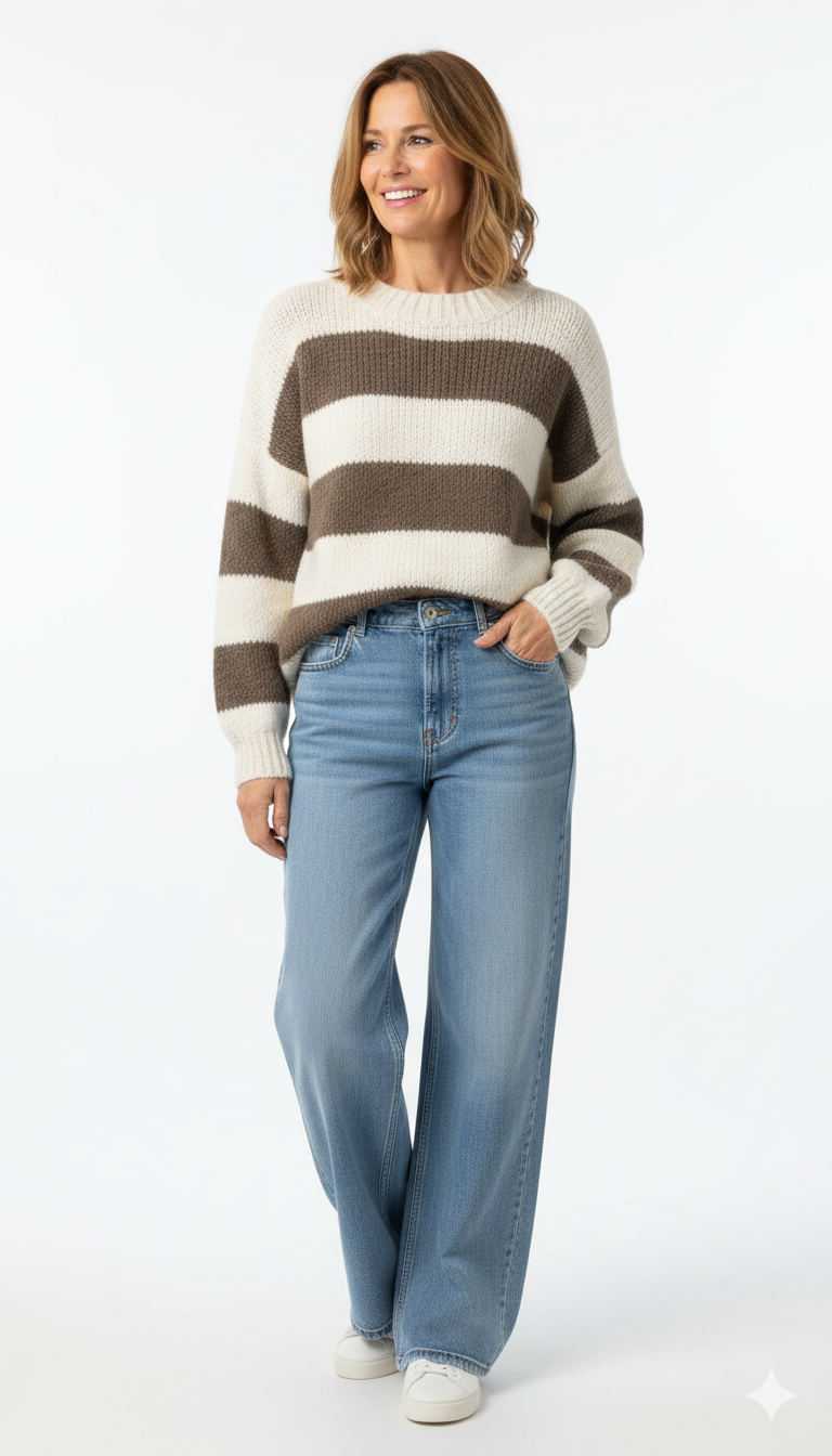 Beige Taupe Gestreepte Trui Zachte Damestrui met Brede Strepen