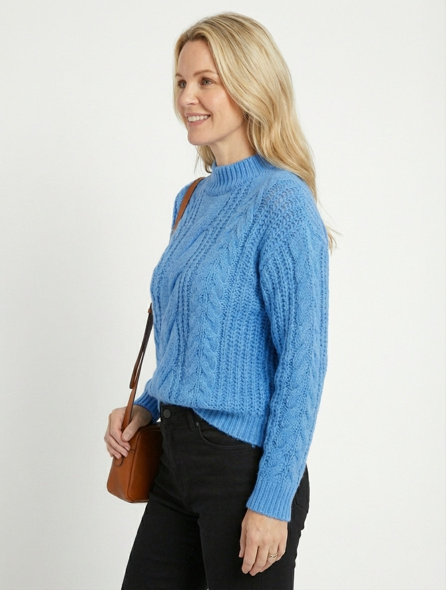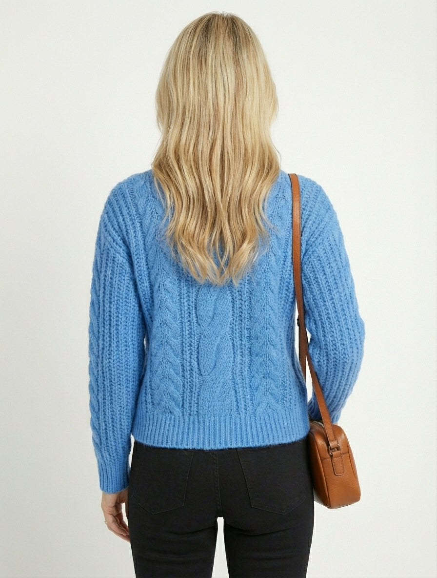 Normale prijs €18,95PRETTY! Wij vinden deze trui echt geweldig! De trui is heerlijk dik en er zitten leuke gebreide kabels in! De stof is lekker zacht en warm voor de winter. Dit item is de perfecte basic voor op een leuke jeans of broek.