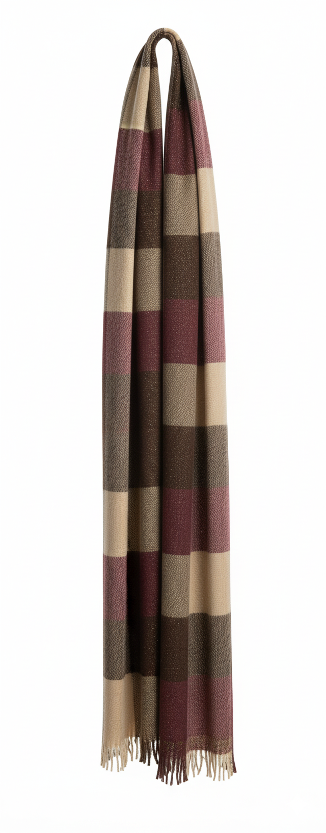 Geruite sjaal in beige, bruin en bordeaux met franjes – warme dames sjaal.