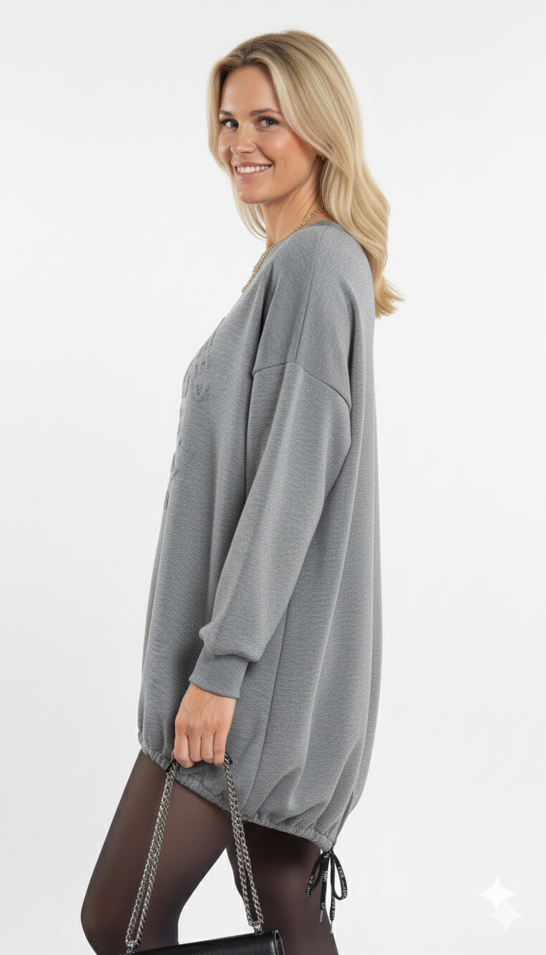 Maak kennis met Grijze Oversized Sweaterdress met Reliëfprint Comfortabel & Trendy Damesmodel