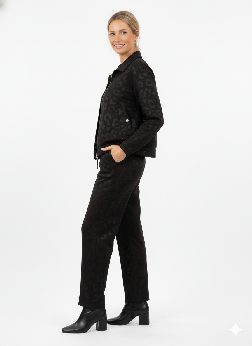 Maak kennis met pure elegantie in deze bruine set met subtiele panterprint – een stijlvolle combinatie van comfort en klasse. De set bestaat uit een modern jack met ritssluiting en een bijpassende broek met rechte pijpen. De rijke bruine kleur en de ton-sur-ton panterprint geven de outfit een verfijnde, exclusieve uitstraling.