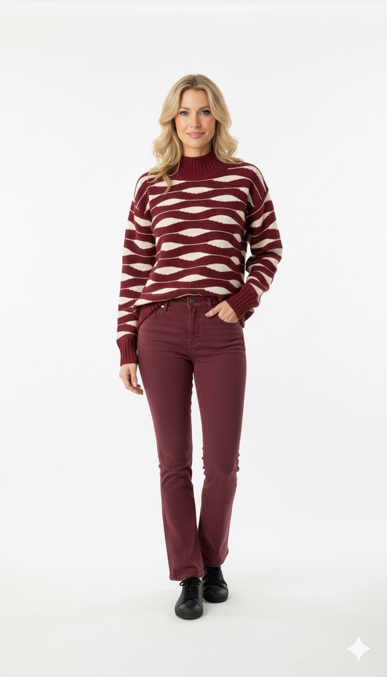 Bordeauxrode Gebreide Trui met Beige Golvenpatroon Warme & Modieuze Damestrui