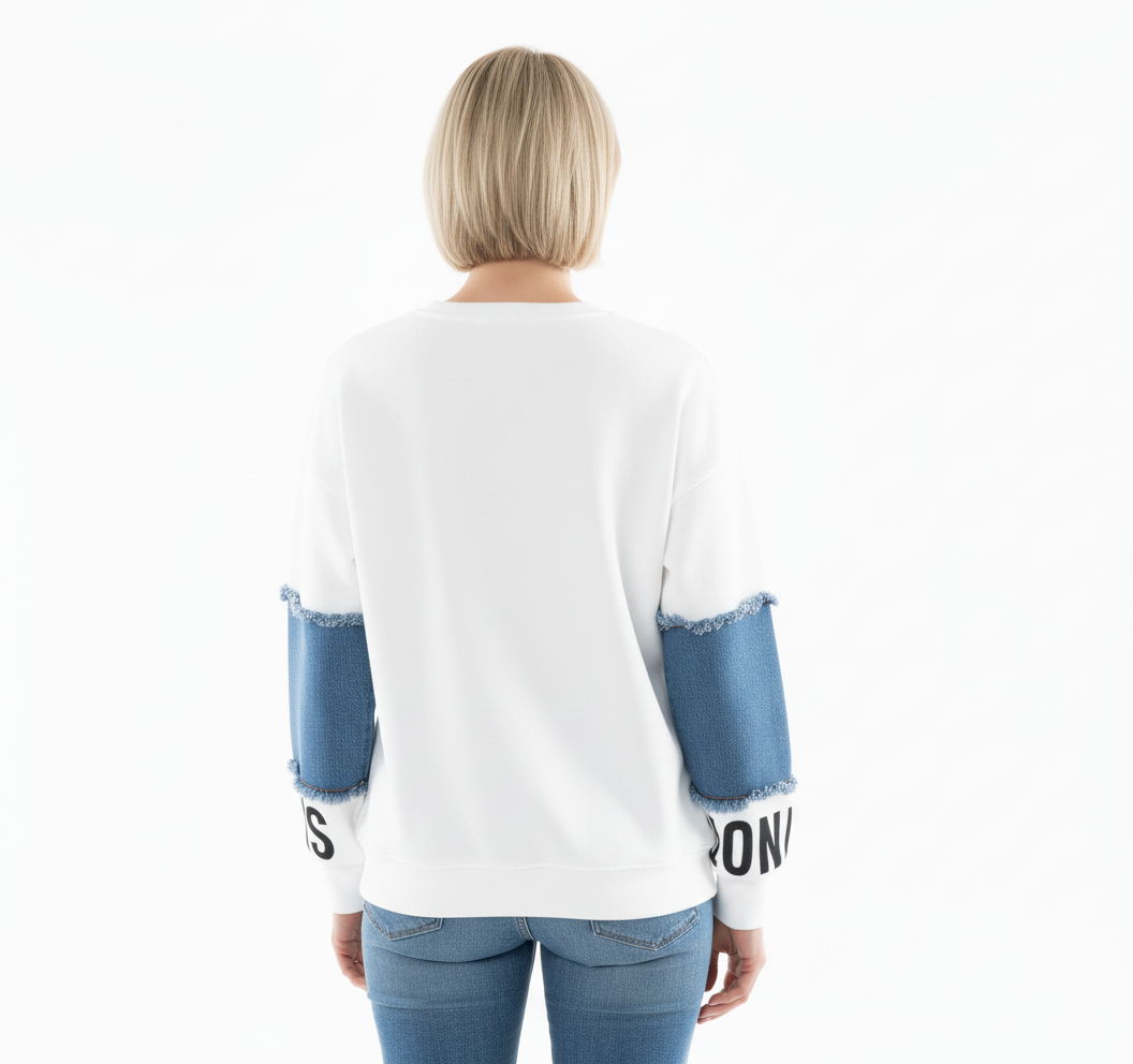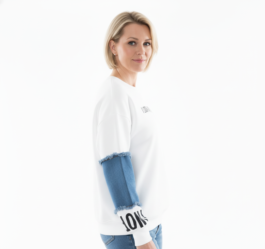 Witte dames sweater met denim mouwen & tekstprint – Oversized fit