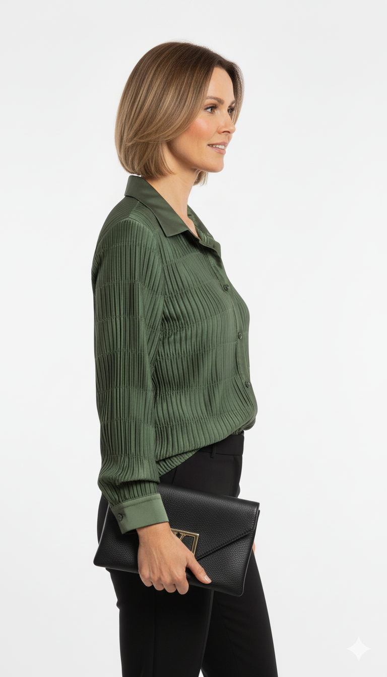 Bestel nu en voeg deze elegante groene geplooide blouse toe aan je garderobe. Perfect voor elke chique gelegenheid!