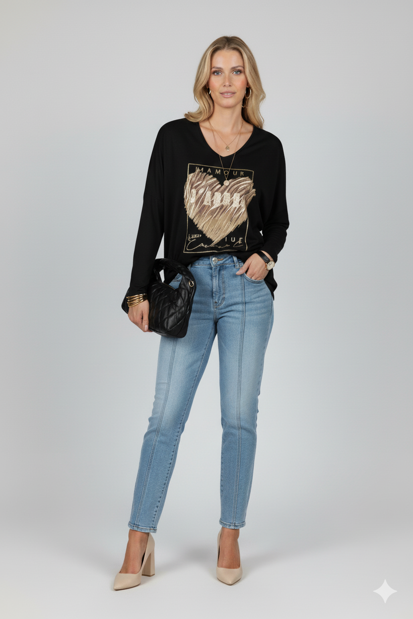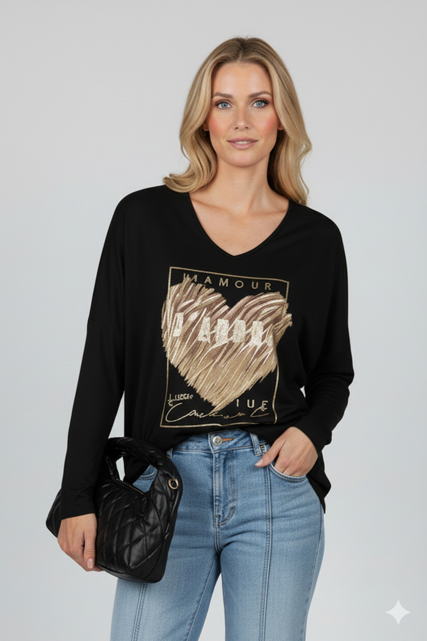 Voeg Parijse elegantie toe aan je garderobe met deze zwarte trui met gouden ‘J’Adore’ print. De trui is gemaakt van een zachte, soepele stof die heerlijk aanvoelt en mooi valt. De sprankelende gouden print met hartmotief en Franse tekst “L’amour, J’adore, Je t’aime” maakt dit item een echte blikvanger.