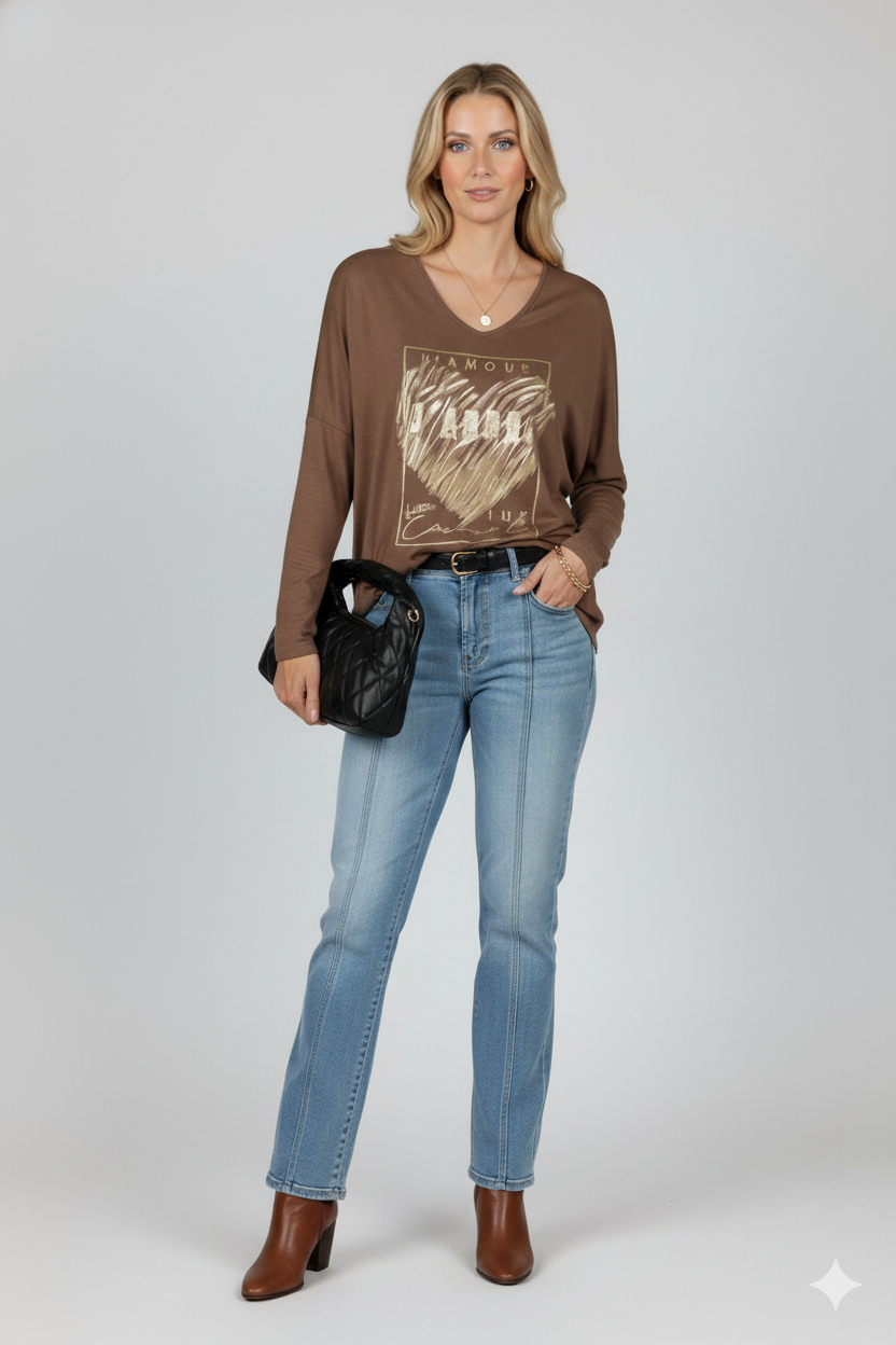 Bruine “L’Amour J’Adore” Top Trendy Damesblouse met Print