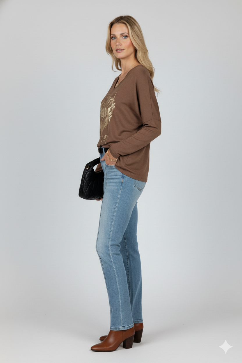 Ontdek de charme van Parijse elegantie met deze bruine “L’Amour J’Adore” damesblouse. Gemaakt van een zachte, soepele stof met een lichte stretch, biedt deze top ultiem draagcomfort zonder in te leveren op stijl.