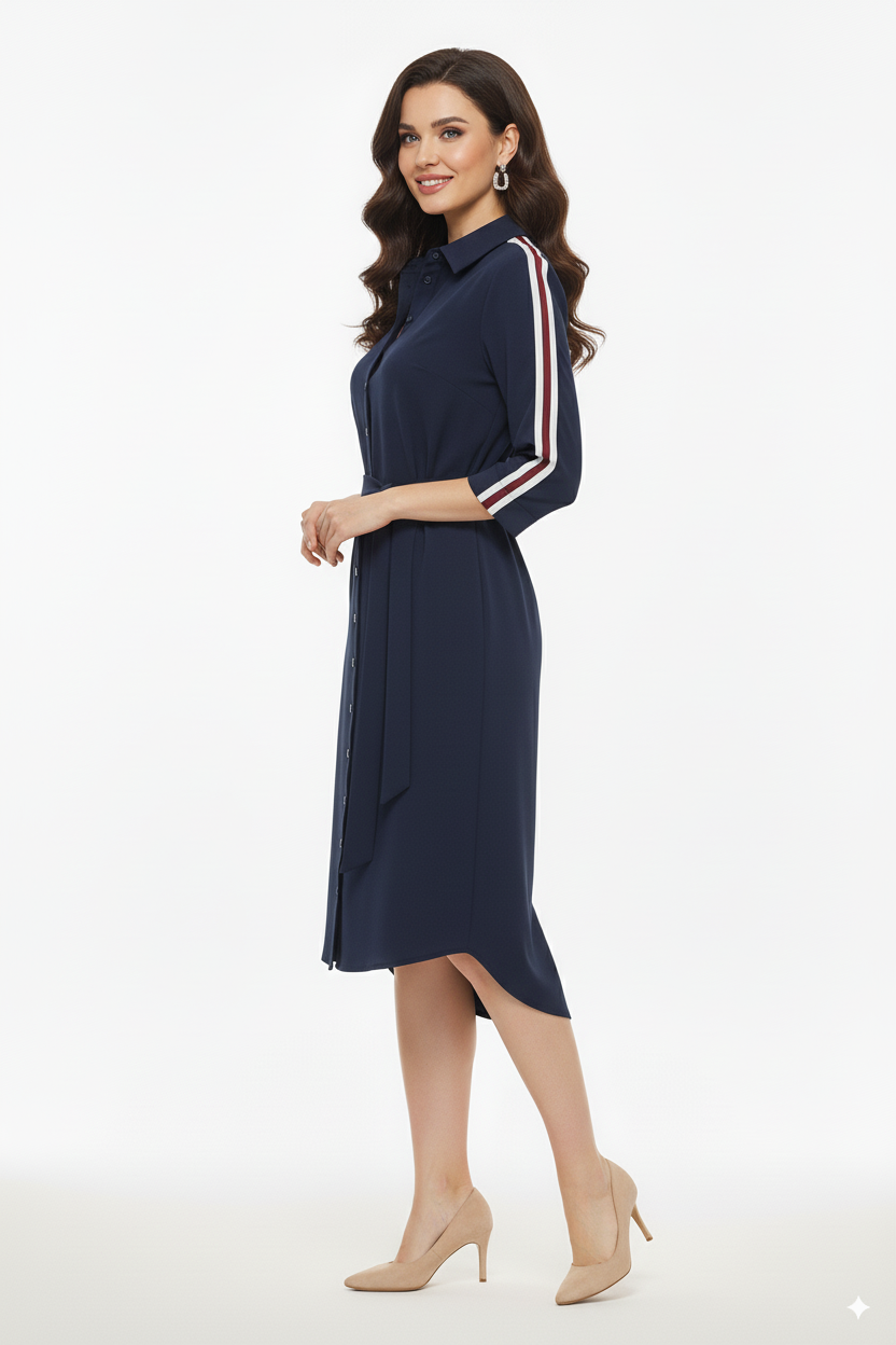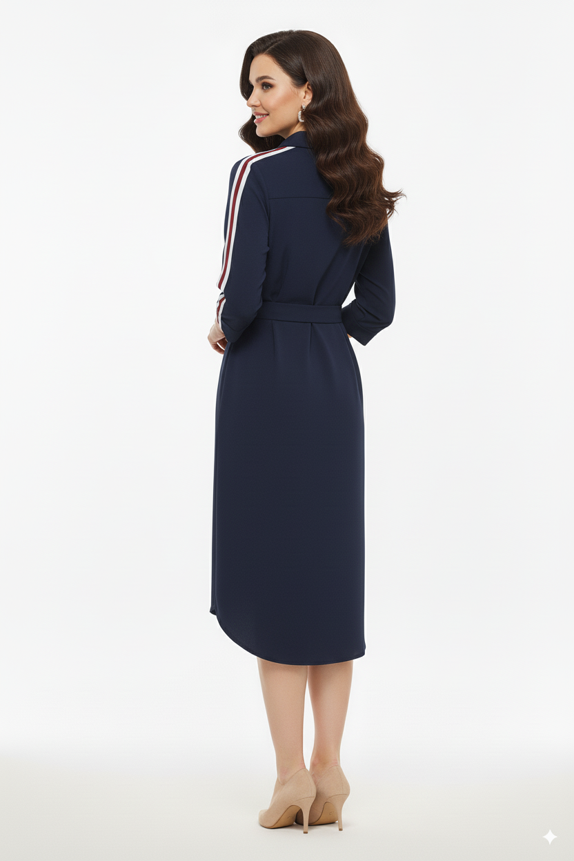 Mi Piace – Navy Overhemdjurk met Sportieve Strepen en Ceintuur