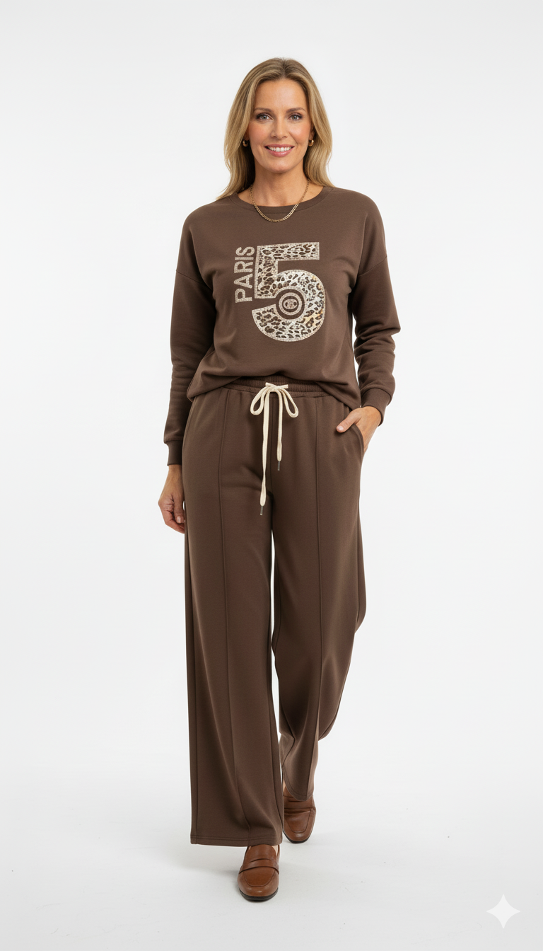 Voeg een vleugje Parijse stijl toe aan je outfit met deze bruine dames sweater met “PARIS 5” luipaardprint. De opvallende print met glinsterende details zorgt voor een luxueuze uitstraling, terwijl de zachte stof het ultieme comfort biedt.