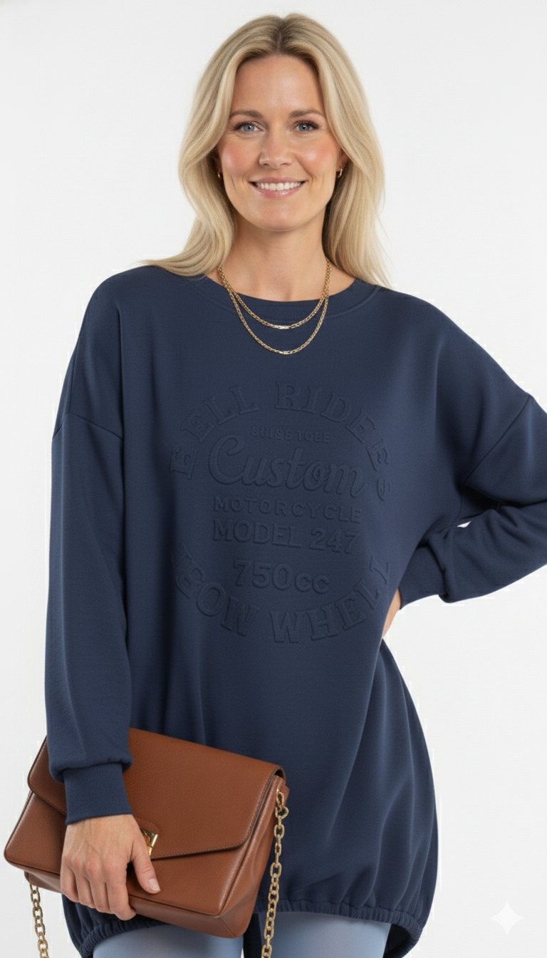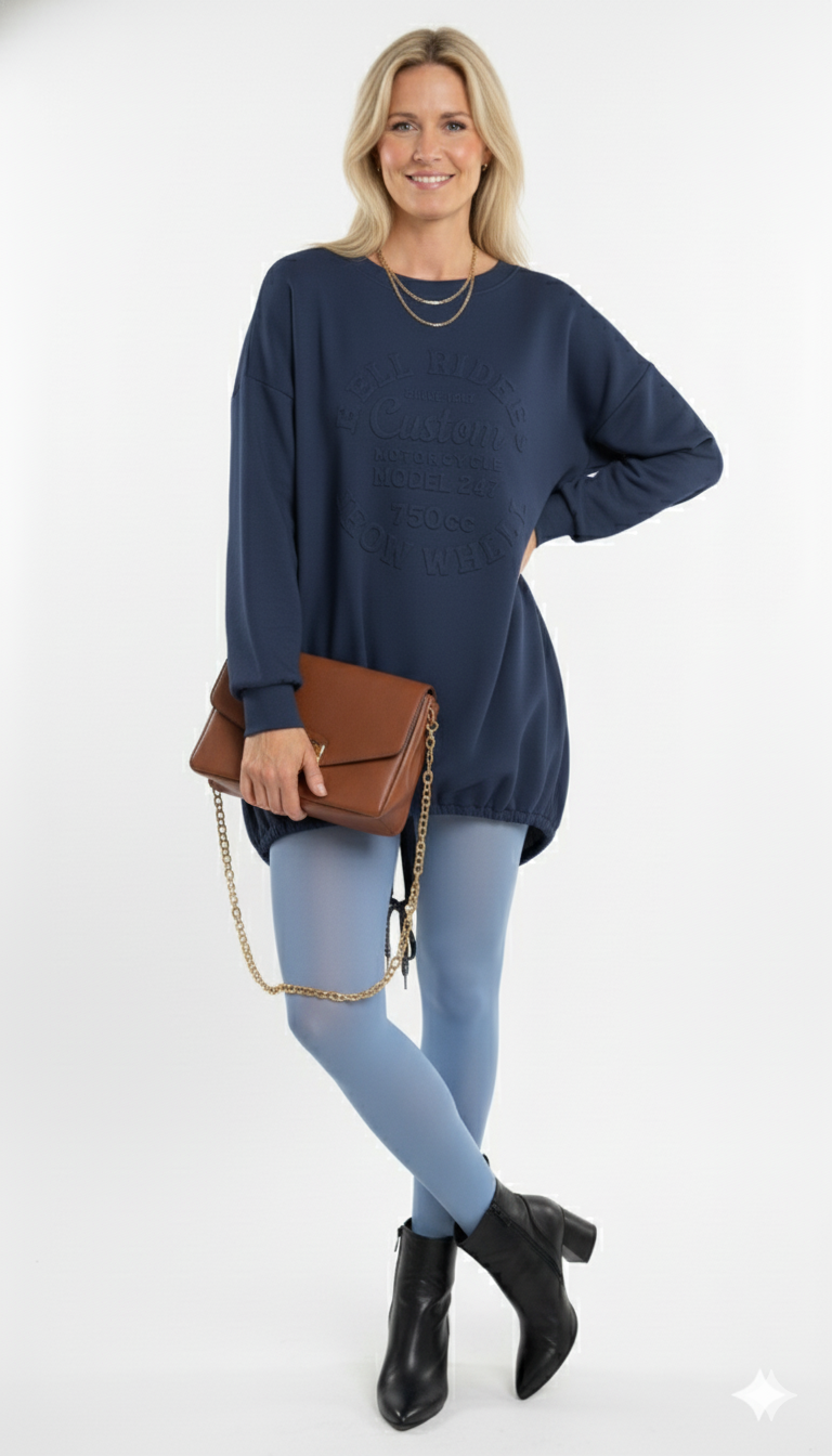 Deze donkerblauwe oversized sweaterdress combineert comfort en stijl in één veelzijdig item. Gemaakt van een zachte, elastische stof die soepel valt en aangenaam draagt. De subtiele reliëfprint met “Custom Motorcycle” detail geeft de sweaterdress een stoere, moderne uitstraling met een vrouwelijke twist.