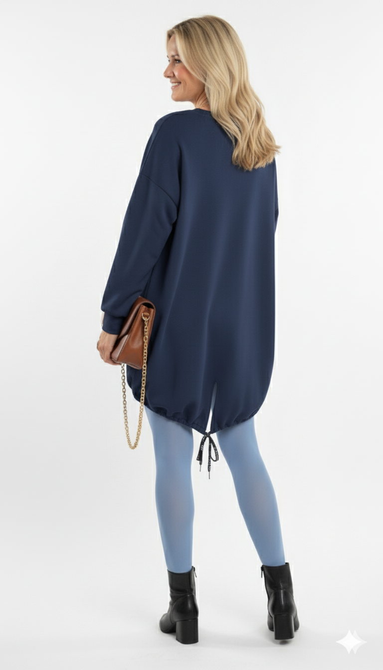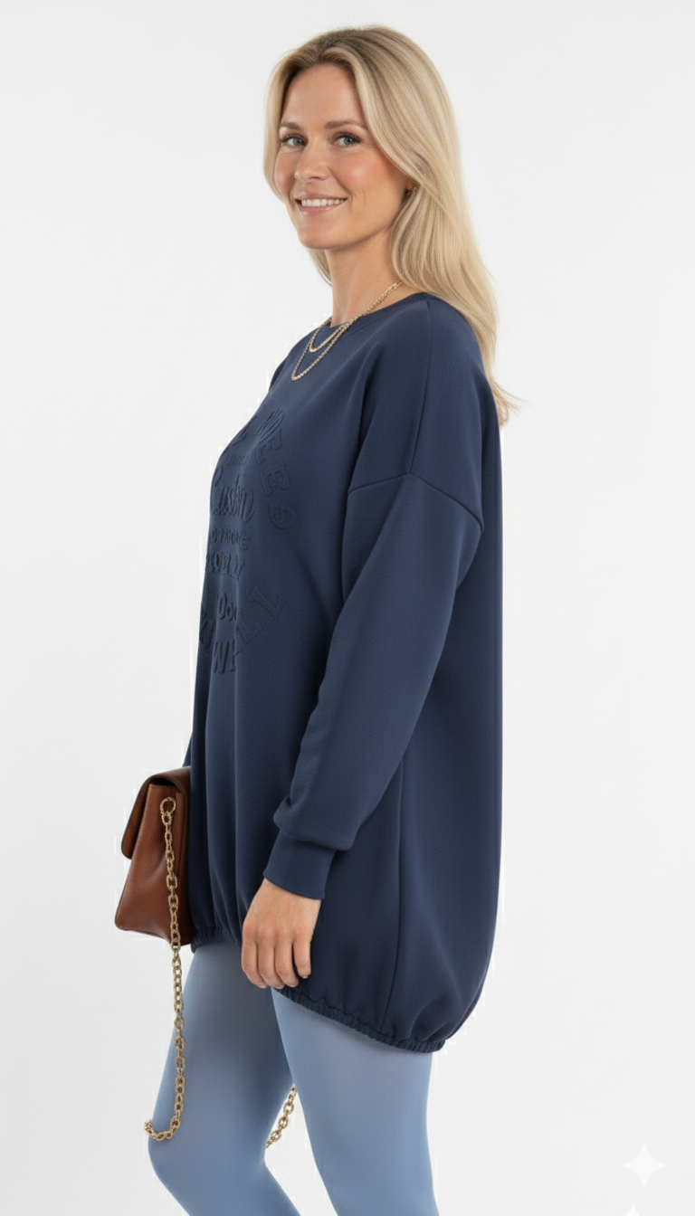 Donkerblauwe Oversized Sweaterdress met Reliëfprint Comfortabel & Trendy Damesmodel