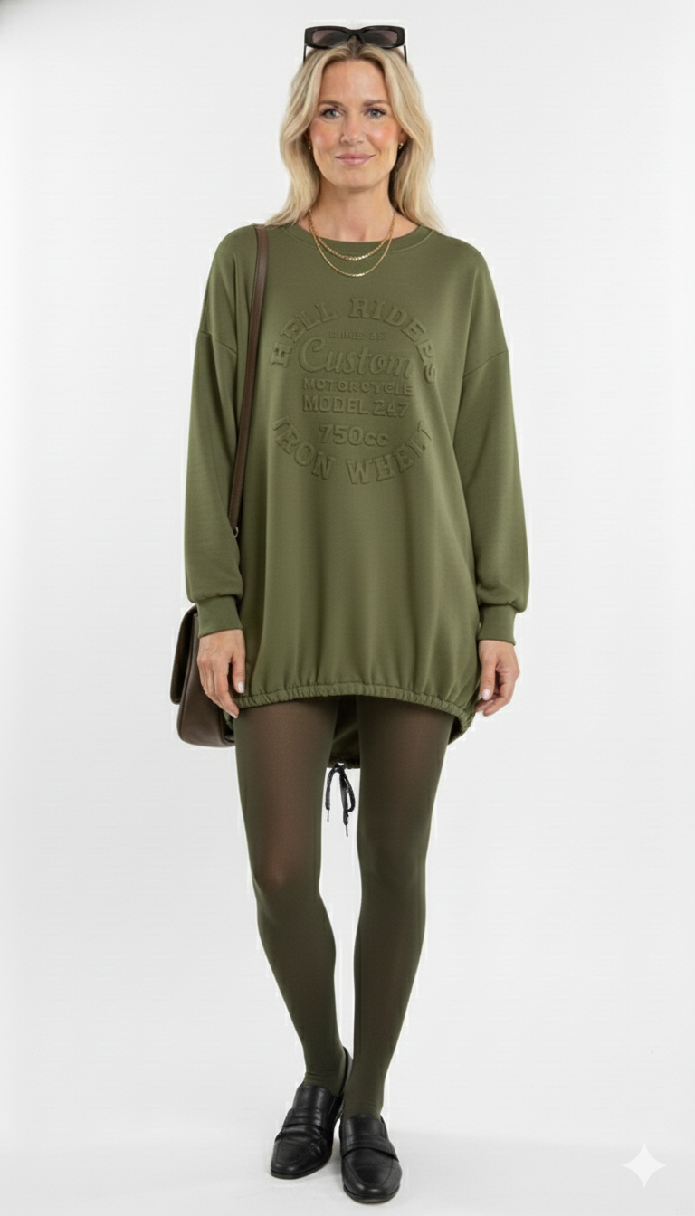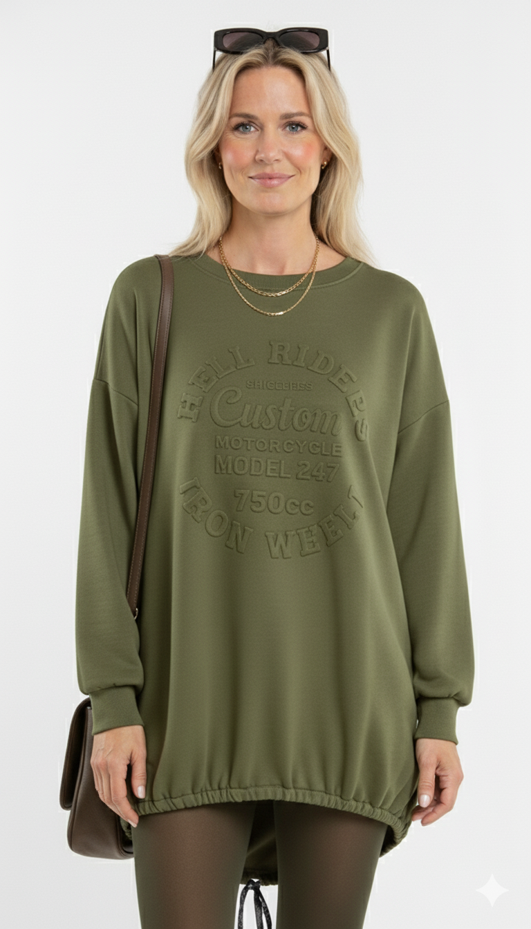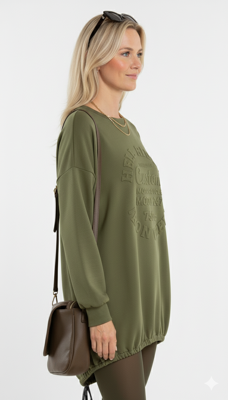 Legergroene Oversized Sweater met Reliëfprint Stoer & Comfortabel Damesmodel
