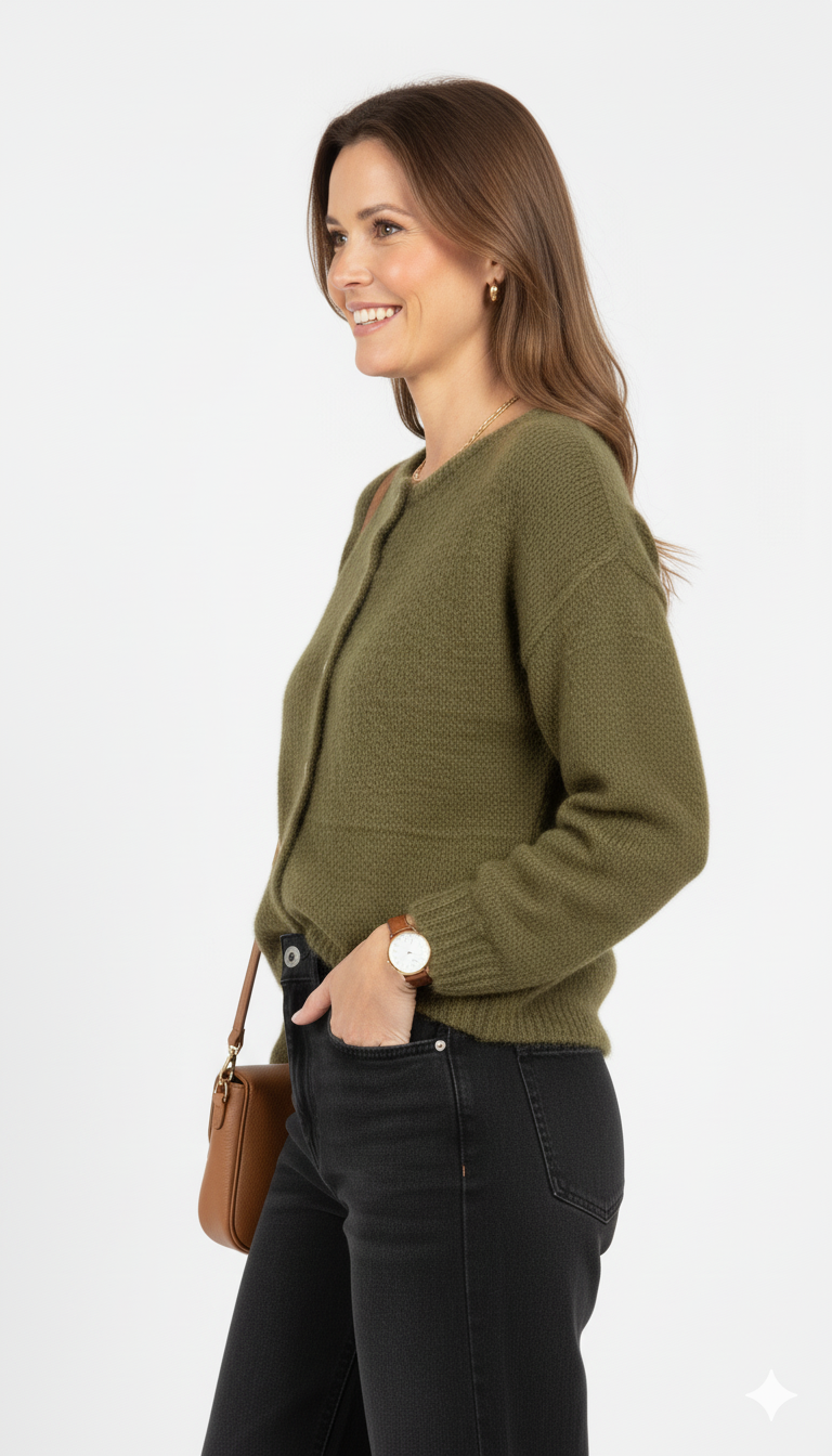 De cardigan heeft een ronde hals, knoopsluiting en een relaxed silhouet dat moeiteloos mooi valt. De diepe groentint zorgt voor een moderne, natuurlijke uitstraling en is gemakkelijk te combineren met zowel lichte als donkere kleuren, van denim tot zwarte basics.