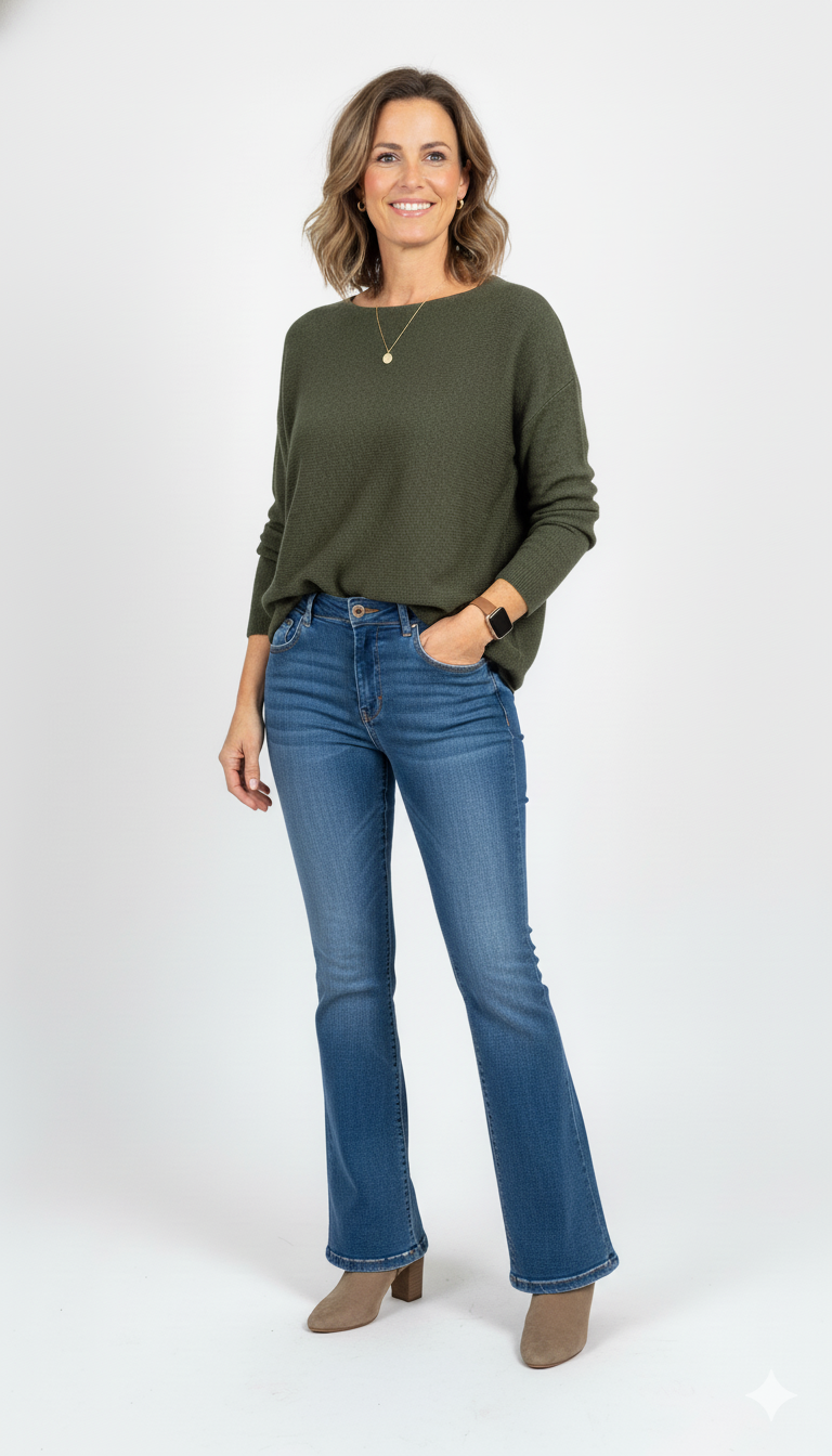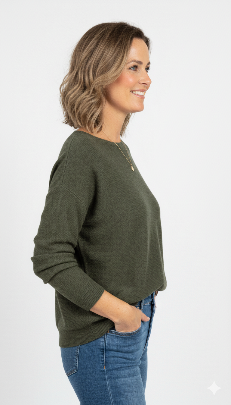 De losvallende pasvorm en driekwartmouwen geven een verfijnde, casual-chique uitstraling. De subtiele textuur in de stof zorgt voor een luxe finish, terwijl de diepe groene tint moeiteloos te combineren is met zowel denim als neutrale kleuren.
