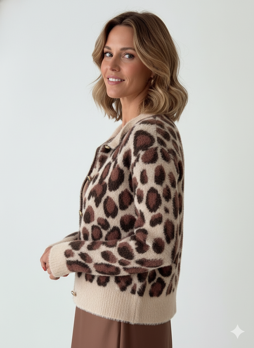 Maak kennis met Beige Dames Cardigan met Luipaardprint Zachte Gebreide Vest met Gouden Knopen